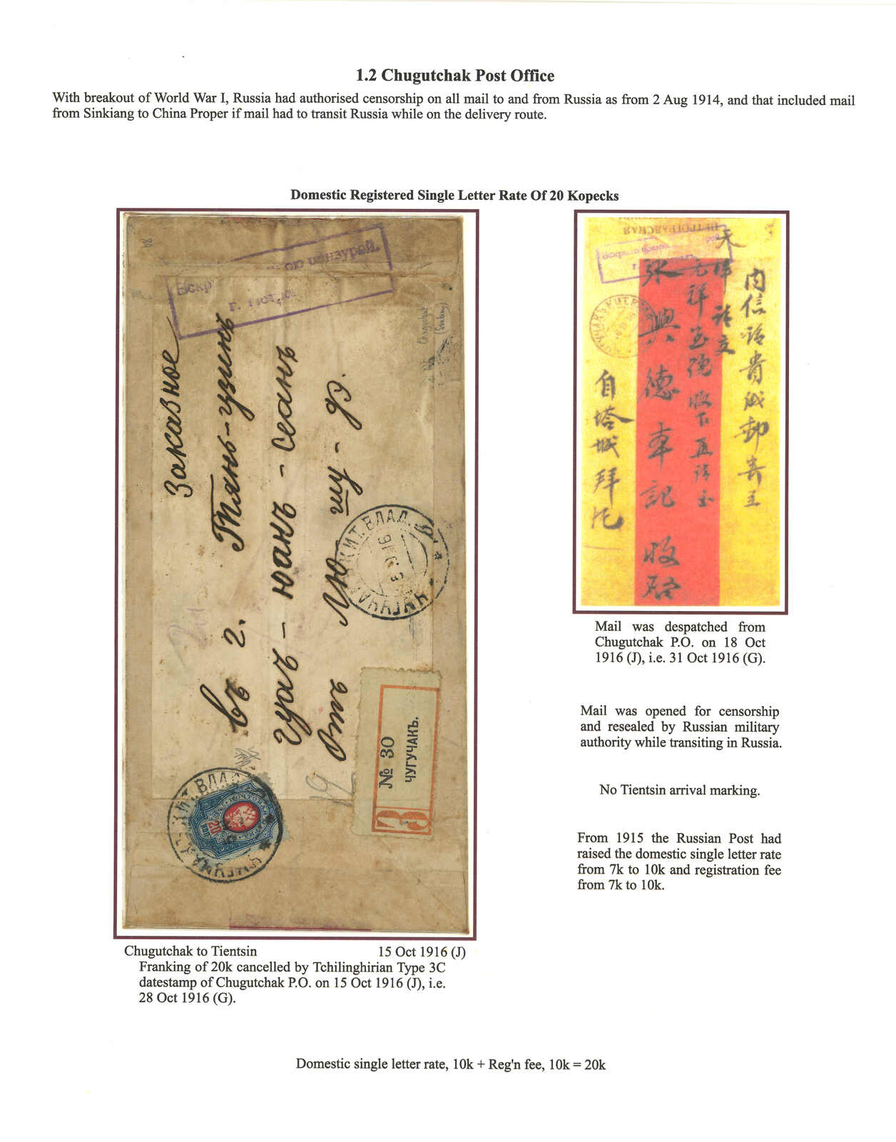 1916 Chuguchak (18 Oct) to Tientsin. Registered red band cover, f.w. Coat of Arms 20k on reverse, tied by Chuguchak Russian PO type C3 cds., alongside with type CR1 registered label. Censored and resealed. No arrival.