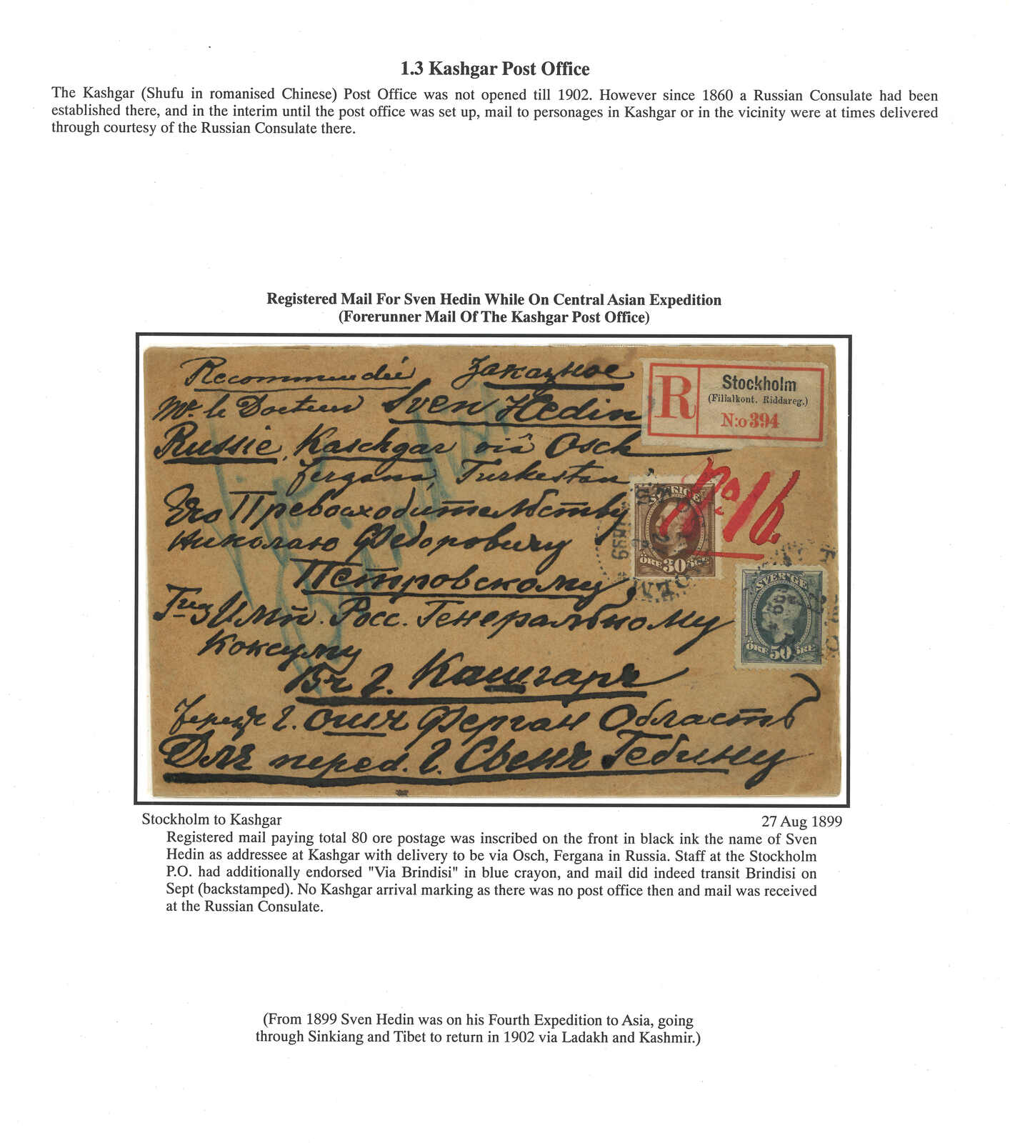 1899.8.28 瑞典寄喀什之斯文赫定(時值其第四次探險)。掛號封,貼瑞典票30歐爾 + 50歐爾,銷斯德哥爾摩日戳。喀什尚未有俄國郵局故無到達戳。 此信經俄國領事館轉交。可謂喀什俄國客郵局之先驅。(Image 1)