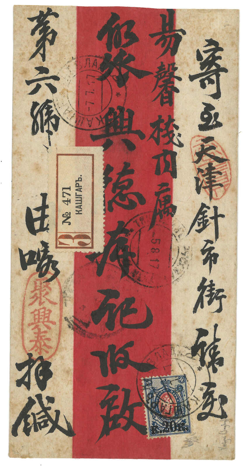 1917 Kashgar (6 Jul) to Tientsin. Registered red band cover, f.w. Coat of Arms surch 20k/14k, tied by Kashgar Russian PO type Ka-2b cds, alongside with type KaR2 registered label. Arrived Tientsin Russian PO (5 Aug).