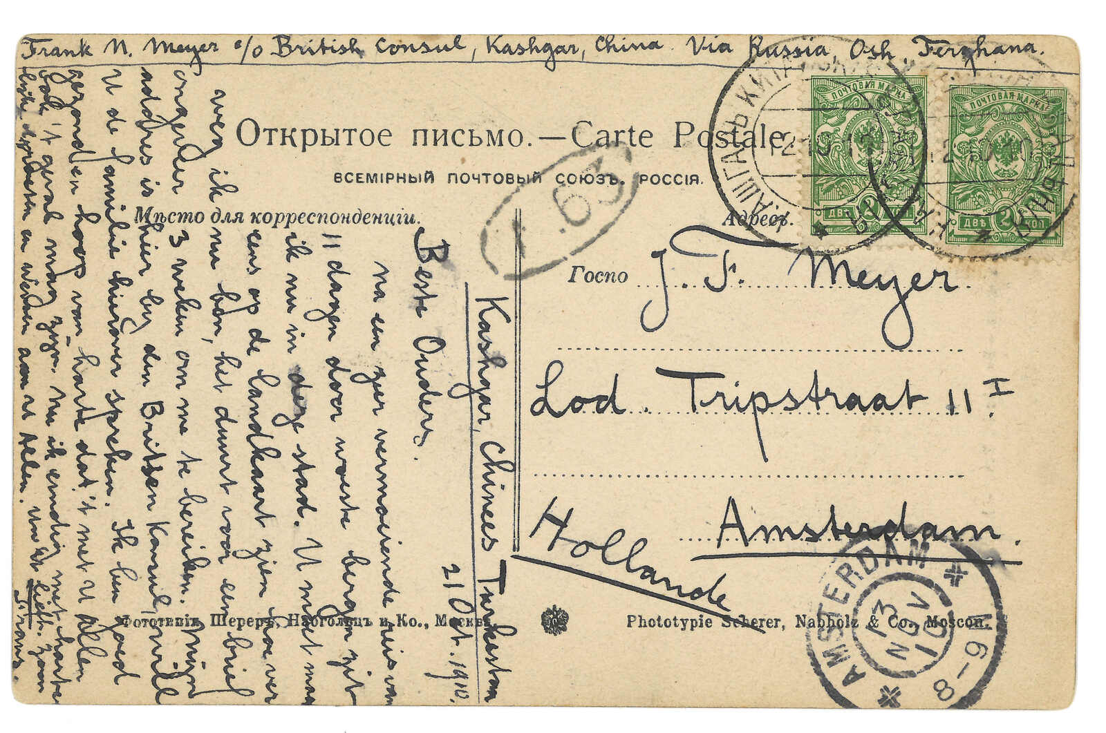 1910 Kashgar (12 Oct) to Holland. Picture postcard, f.w. Coat of Arms 2k in pair, tied by Kashgar Russian PO type Ka-1 cds in black. Showing annotation “c/o British Consul, Kashgar, China via Russian, Osh”. Arrived Amsterdam