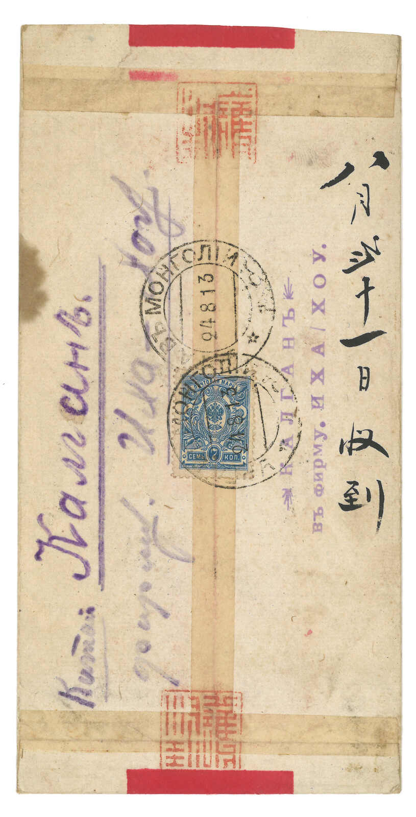 arrival and arrival date manuscript. Joint delivery by Russian Post in Mongolia and Chinese Min Chu. Very scarce. The Magnolia Collection of Russian and Chinese Post Offices in Mongolia (Siegel International)
