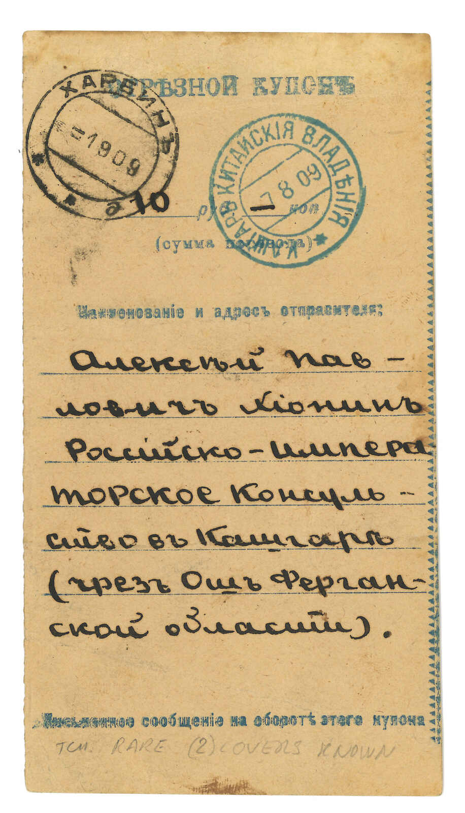 yet opened. The mail was received via Russian Consulate. Forerunner example of Kashgar Russian PO.