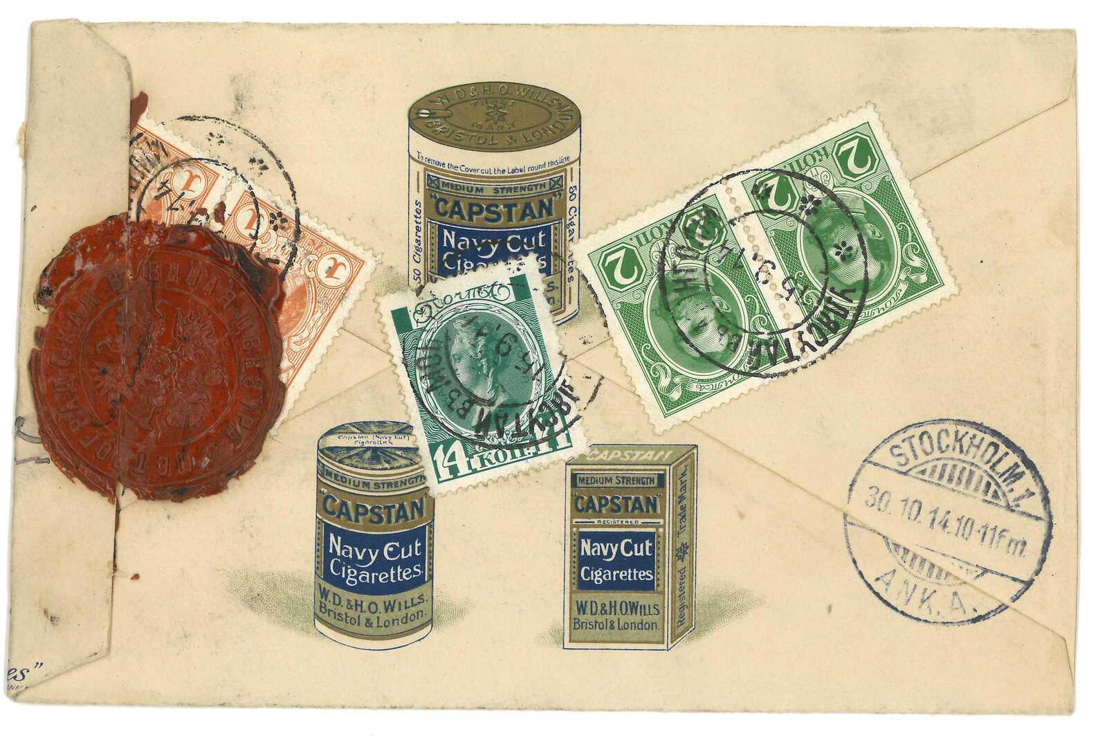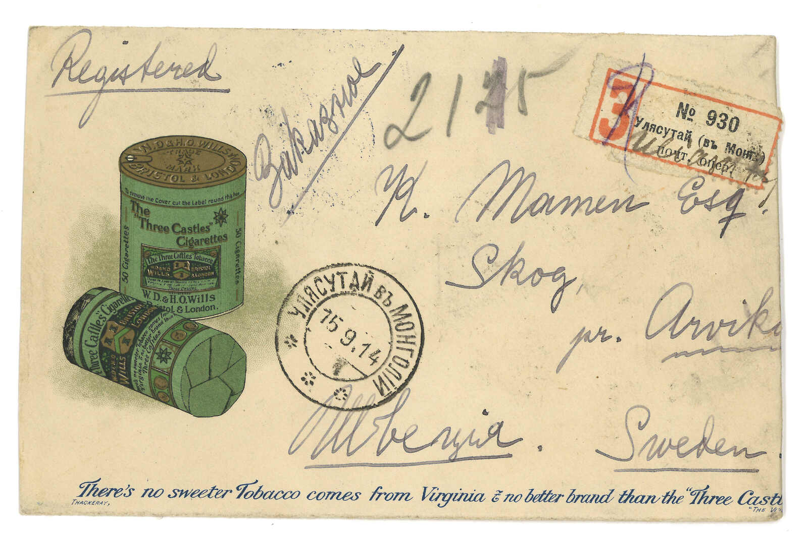 烏里雅蘇台俄國客郵局 1914.9.15 烏里雅蘇台寄瑞典。掛號封,背貼羅曼諾夫1戈比雙連 + 2戈比雙連 + 14戈比,銷極為珍罕之烏里雅蘇台俄國郵局Hellrigl 1型日戳。正貼掛號標籤。10.30抵瑞典。 出自烏里雅蘇台俄國郵局之郵例有如鳳毛麟角,Hellrigl記錄中僅見五例。他更指未見有任何信封蓋有此型郵戳,可見其稀罕程度何其驚人。(Image 1)