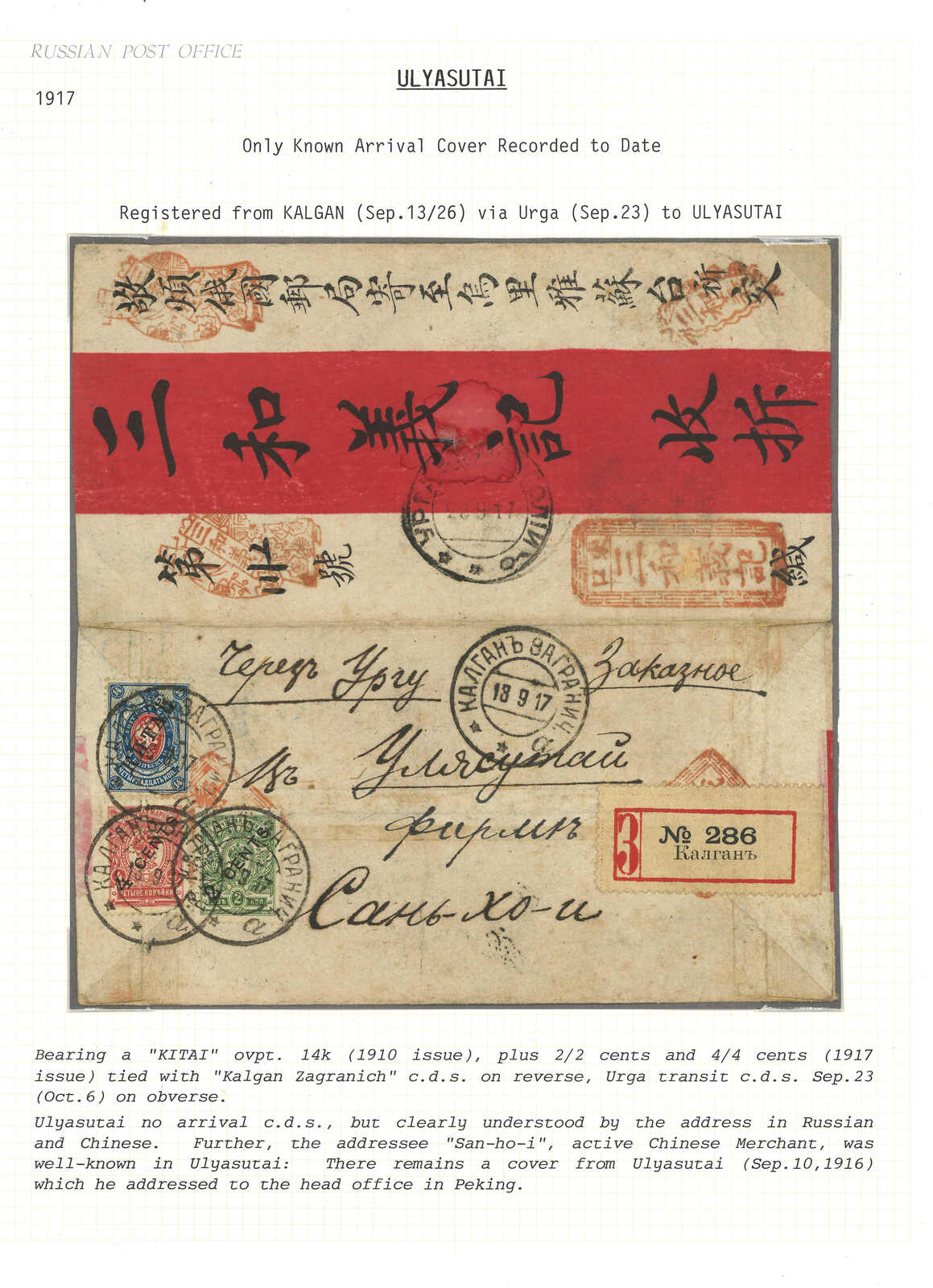 1917. Kalgan (13 Sep) to Ulyasutai. Registered, f.w. Russian and Chinese currency stamps. Transit Urga (23 Sep). No Ulyasutai arrival. Probably unique. Ex-Chazen.