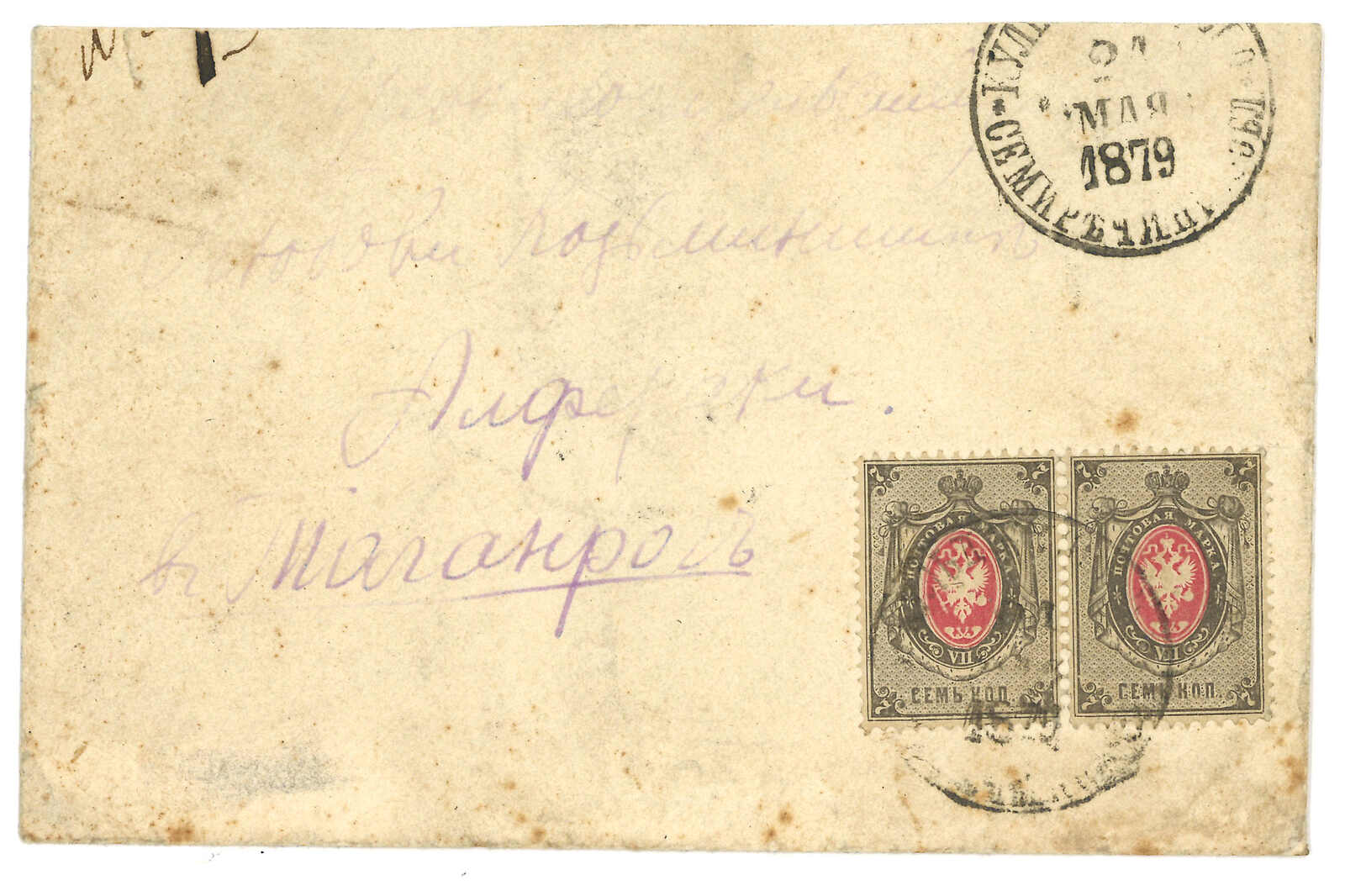 固扎爾(伊犁):1879 年掛號信封,從伊犁寄往俄羅斯塔甘羅格,貼 1879 年 7 戈比雙連票,銷 “七河省/固扎爾郵政分局” 1879 年 5 月 24 日戳(戳面上方有重覆蓋印),塔甘羅格到達戳及俄文手稿批註 “於 5 月 24
