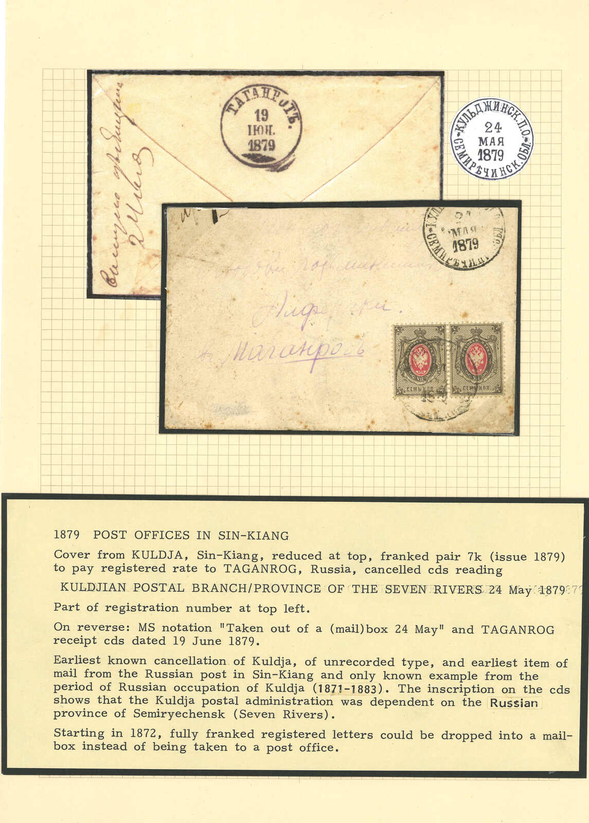 KULDJA: 1879 Registered cover from Kuldja to Taganrog (Russia), with 1879 7k pair tied by “KULDJIAN POSTAL BRANCH / PROVINCE OF SEMIRYECHENSK” (the Seven Rivers) 24.05.79 cds with further strike above, Taganrog bs &