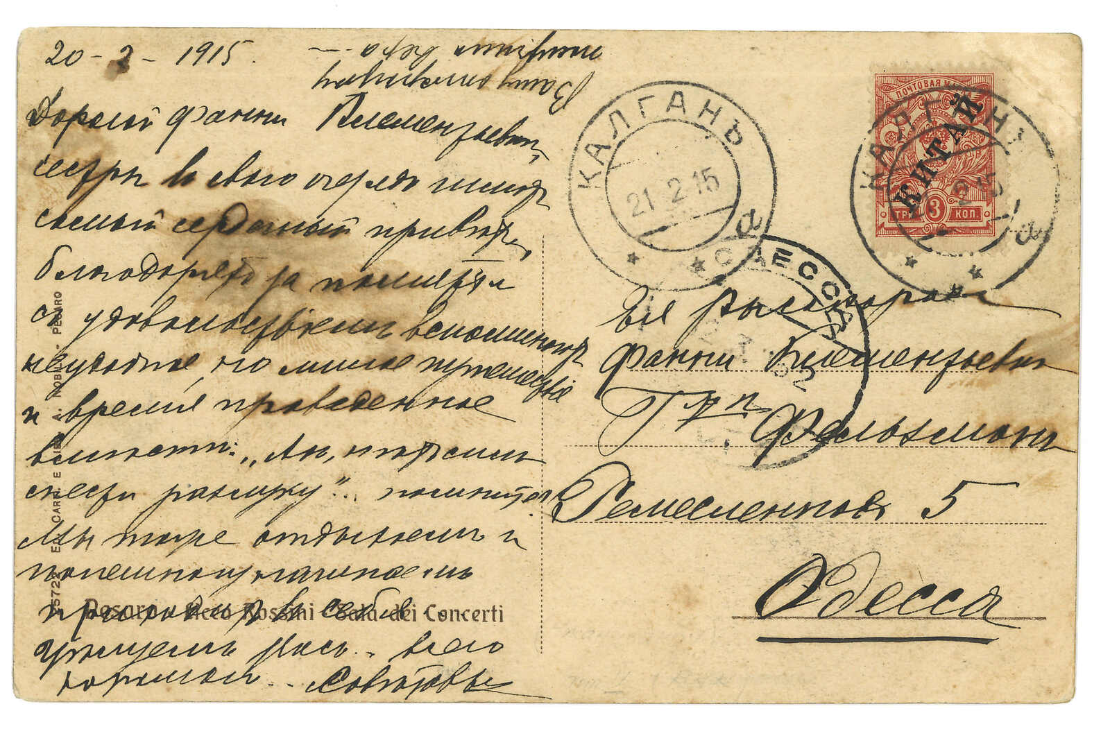 1915.2.21 張家口寄敖德薩。圖片明信片,貼軍徽圖加蓋KITAI 3戈比,銷珍罕之張家口俄局T&S 4型日戳。3.22抵敖德薩。張家口俄局與蒙古之俄國客郵局一樣,在1917年前都使用未加蓋俄國票,故此例貼用加蓋KITAI票難得。(Image 1)