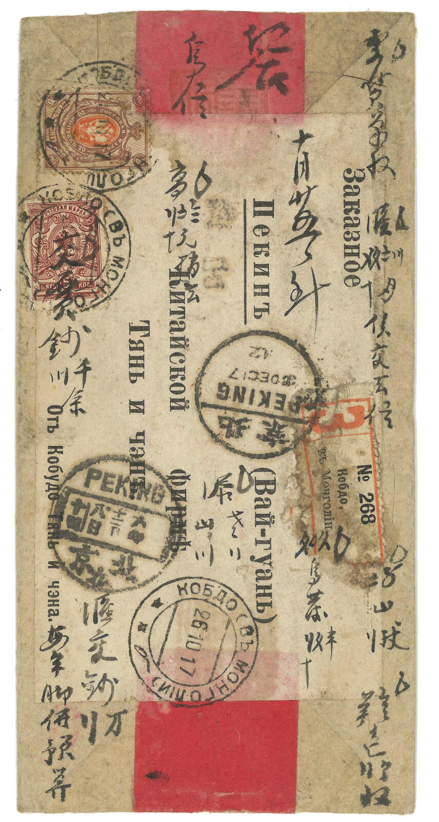 RUSSIAN POST IN KOBDO 1917 Kobdo (8 Nov; Julian calendar 26 Oct) to Peking. Red band cover, f.w. Russian Coat of Arms 5k + 70k, tied by scarce Kobdo Russian PO type 1b cds, alongside with registered label. Transit Peking