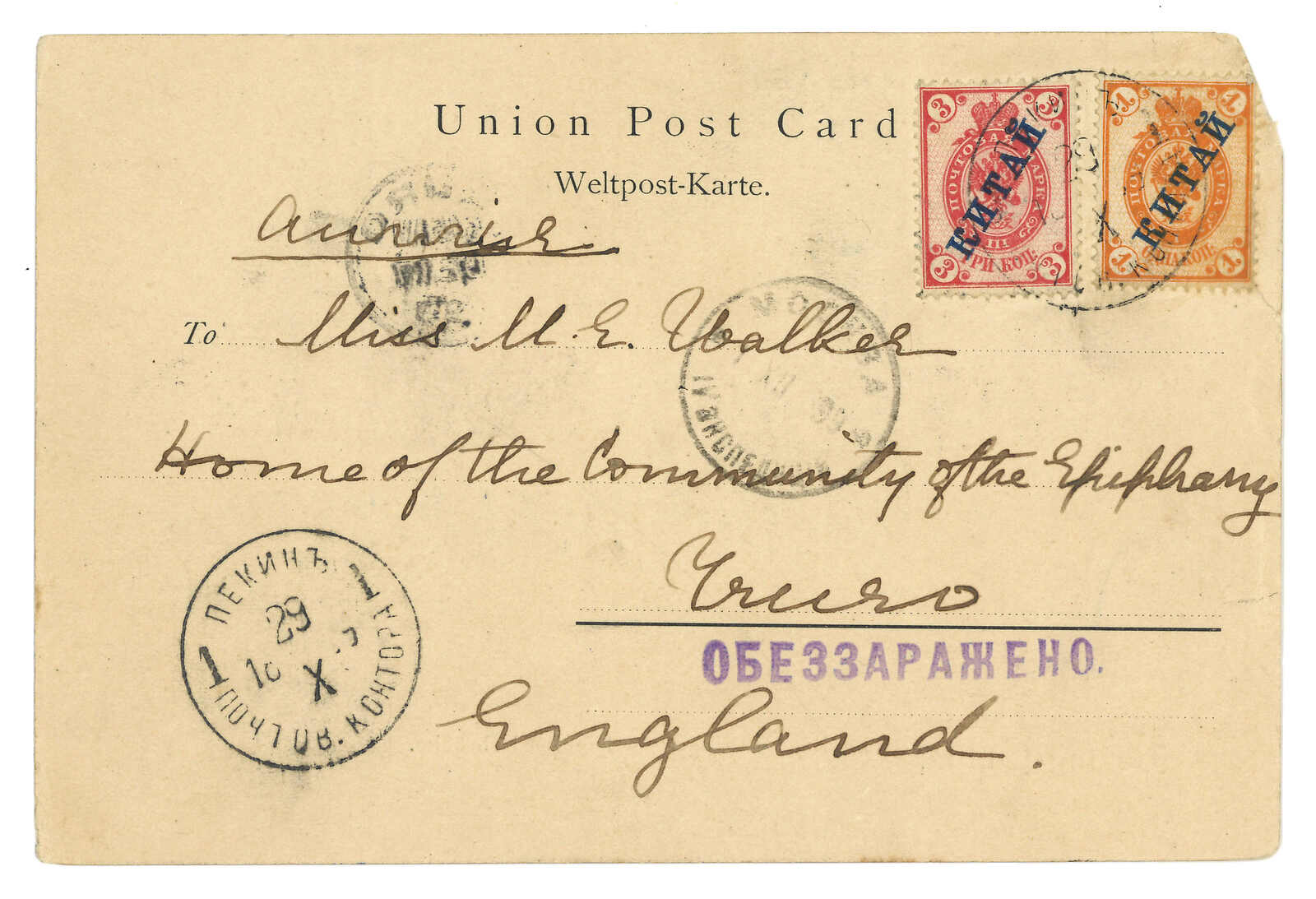 1899 Peking (29 Oct) to England. Peking PPC, f.w. Coat of Arms ovpt. “KITAI” 1k + 3k, tied by Peking Russian PO cds. Alongside with scarce Troitskosavsk “OBEZZARAZHEHO” disinfection cachet in violet. Transit Moscow. Arrived
