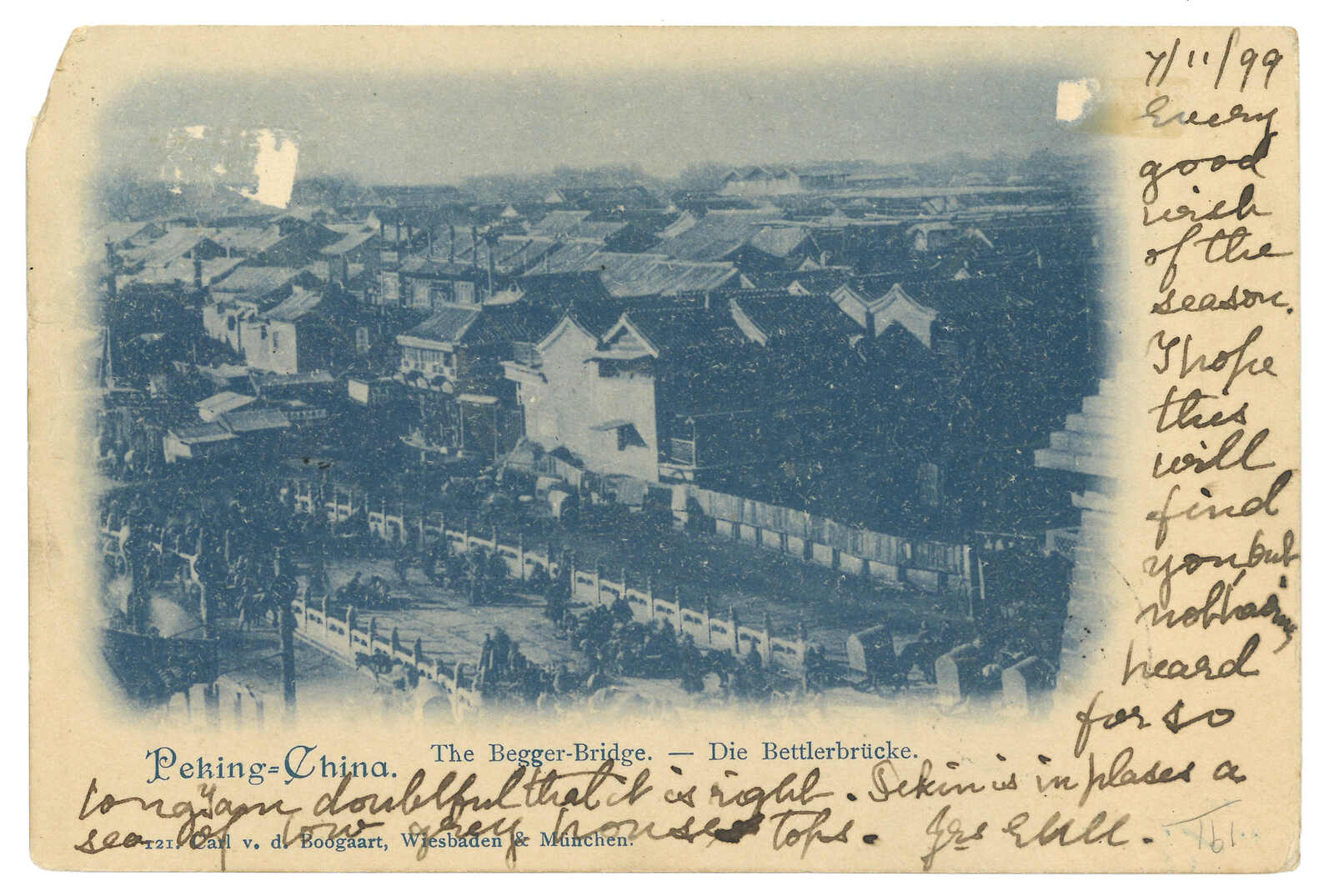 1899.10.29 北京寄英國。北京風光明信片,貼軍徽圖加蓋“KITAI”1戈比 +
