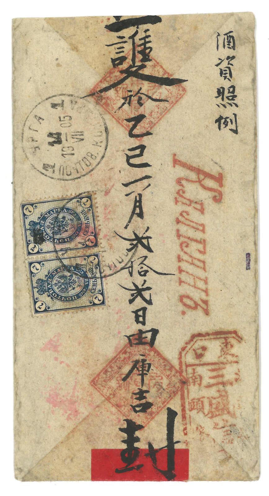 + 5戈比 + 10戈比,以筆劃銷。按批示可知2.19抵北京。以筆劃銷為蒙古俄國客郵局最早之銷票形式,存世例子按Hellrigl記載僅有14件,此為當中日期最早者,極為稀罕難得。1985年Feldman Auction,拍品號10011。(Image 1)