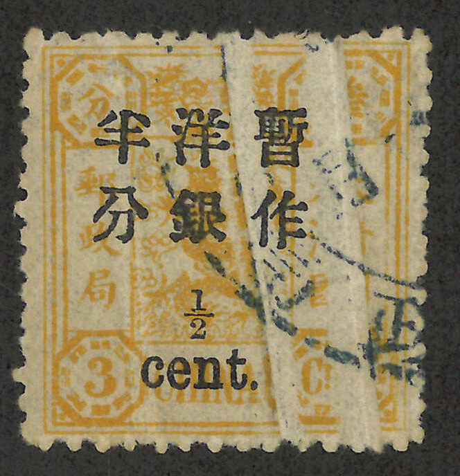 1897年慈壽初版加蓋小字半分蓋3分銀,帶折白變異(陳目37),銷大圓戳。少見之大幅折白變異票。(Image 1)