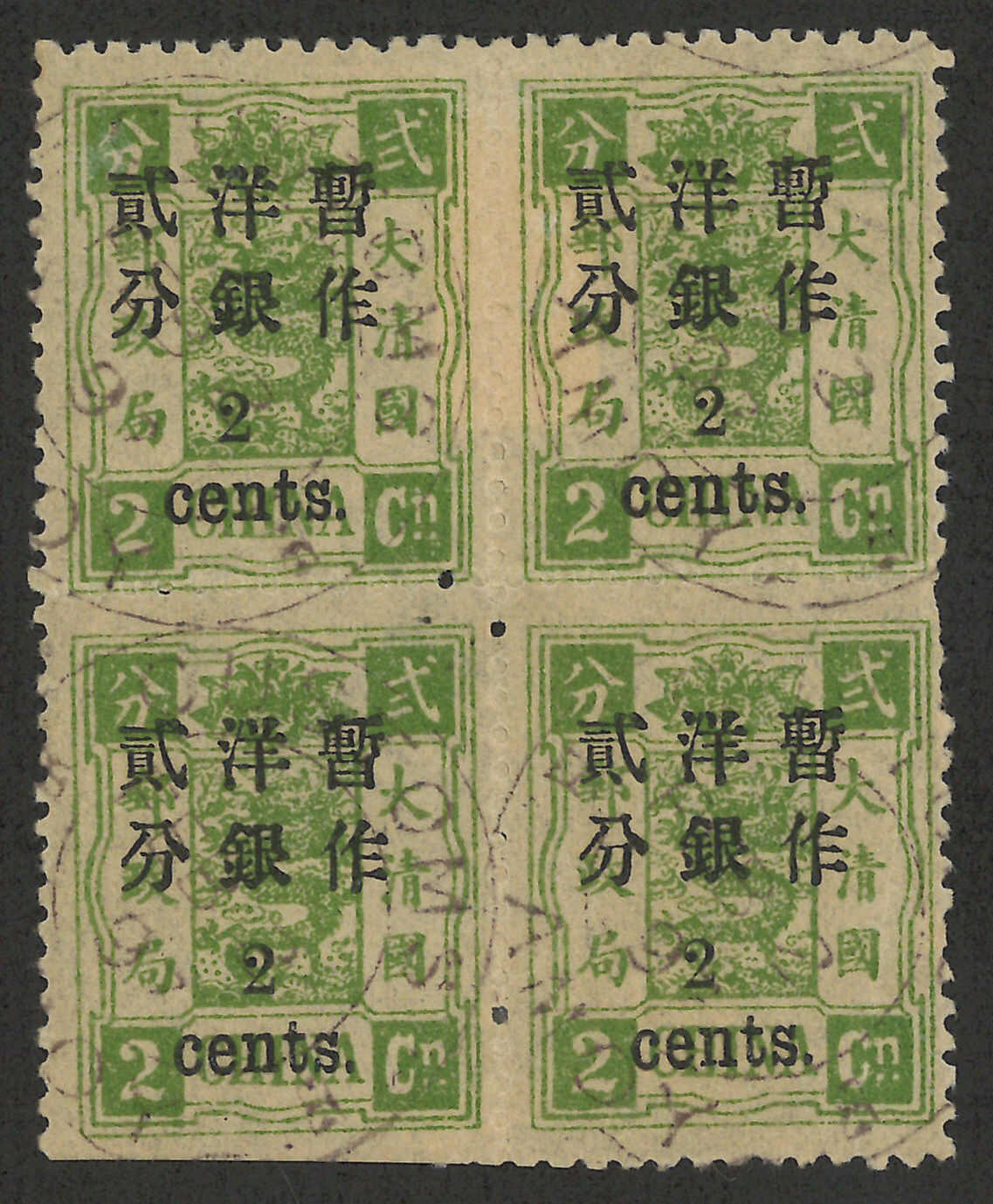 1897年慈壽初版加蓋小字2分蓋2分銀四方連,左上及右下一枚帶“2”字左移變異(陳目39b),背貼。左下一枚短齒。1991.9 倫敦蘇富比Major James Starr專場,拍品號457。(Image 1)
