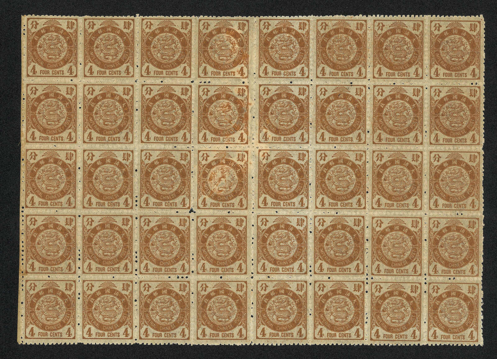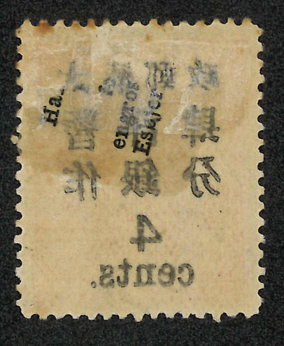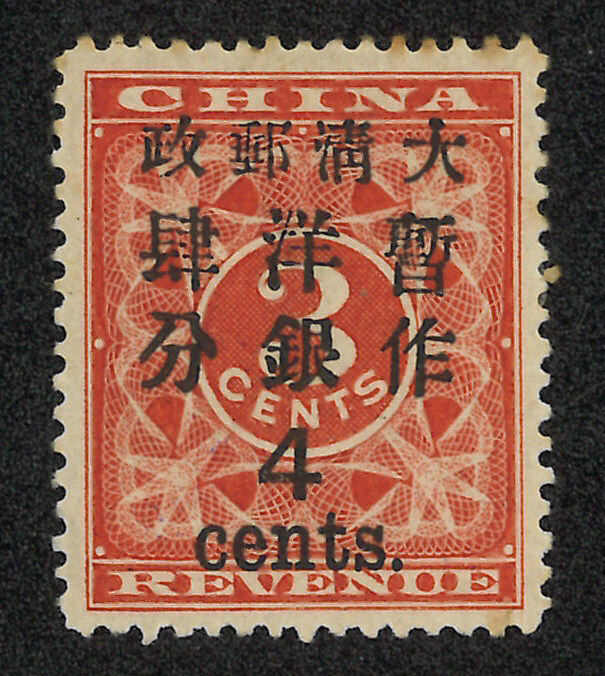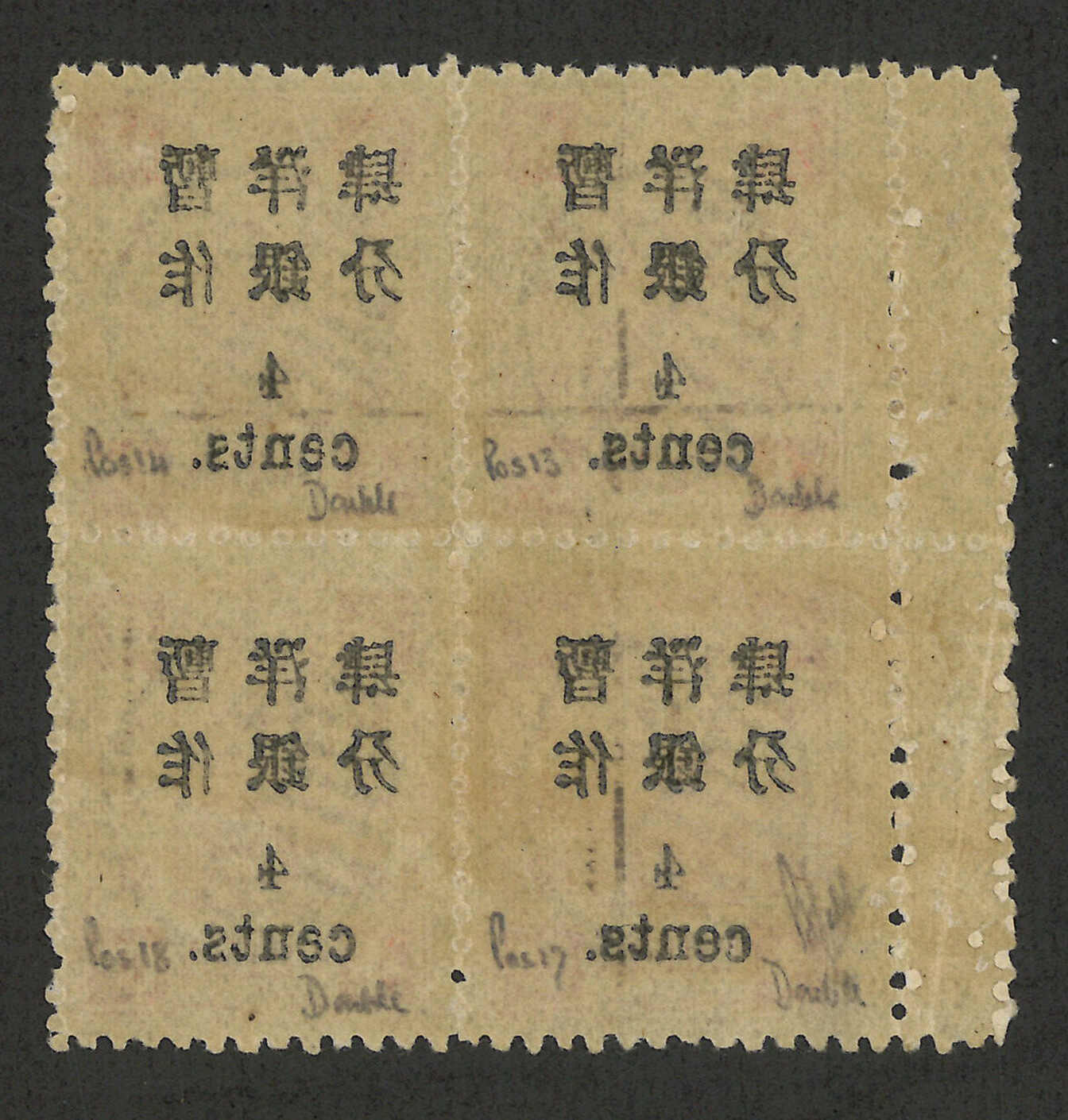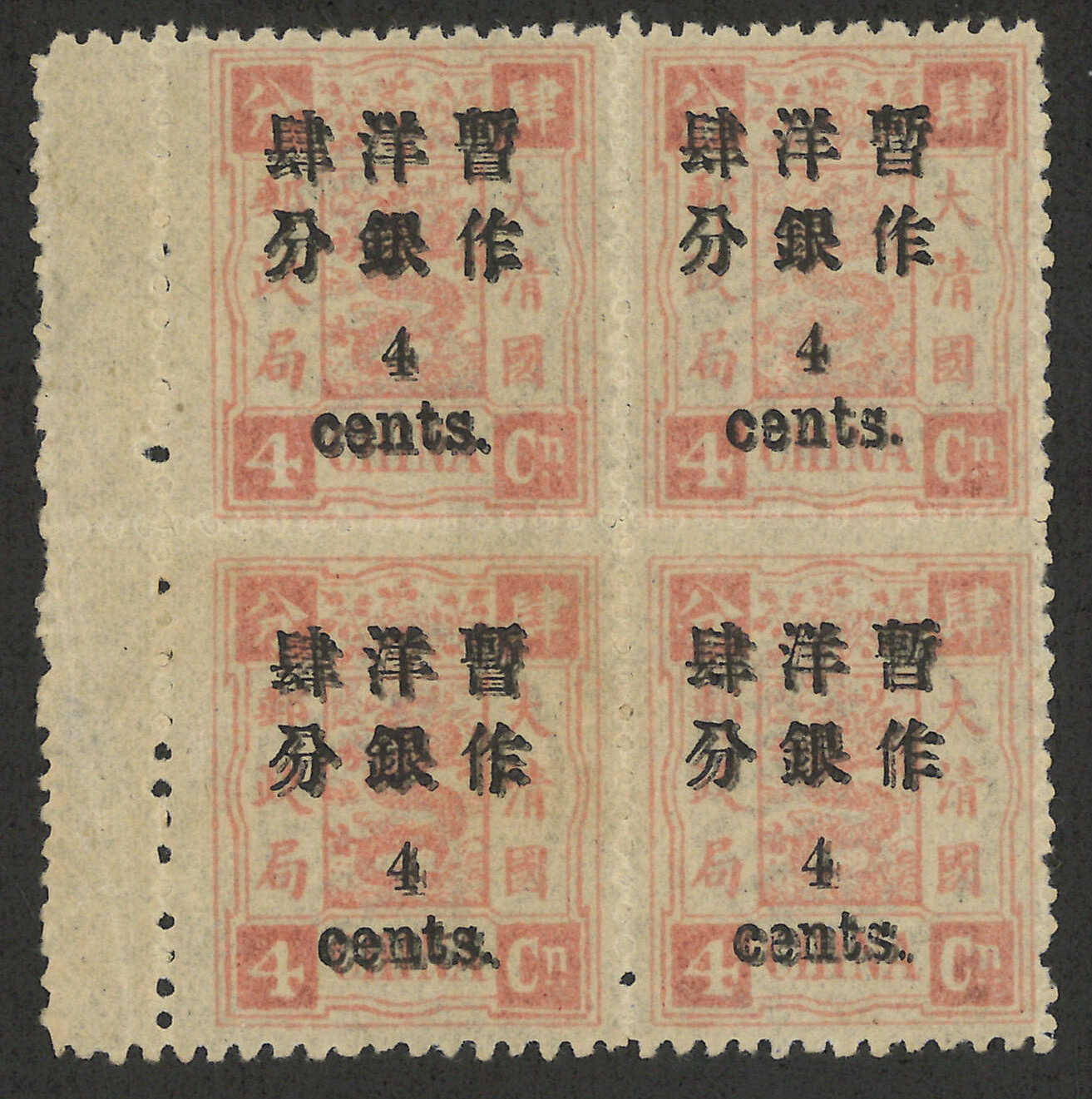 1897年慈壽初版加蓋小字4分蓋4分銀四方連新連左過橋邊紙,帶加蓋複蓋及透印變異(陳目40f),原膠輕貼。背面帶有Peter Holcombe簽署。著名之“四複八倒”之一。此變異票共有一版四十枚存世,按斯賓克中國之統計,曾見24枚新票、6枚舊票及兩件信封。 源流﹕ John Agnew(私人購入) 1969年大維德爵士(原十九方連) 2019.1.18 斯賓克中國,林文琰小龍、慈壽及其加蓋票專場,拍品號709。落槌價60萬港元。 記載﹕ Philatelic