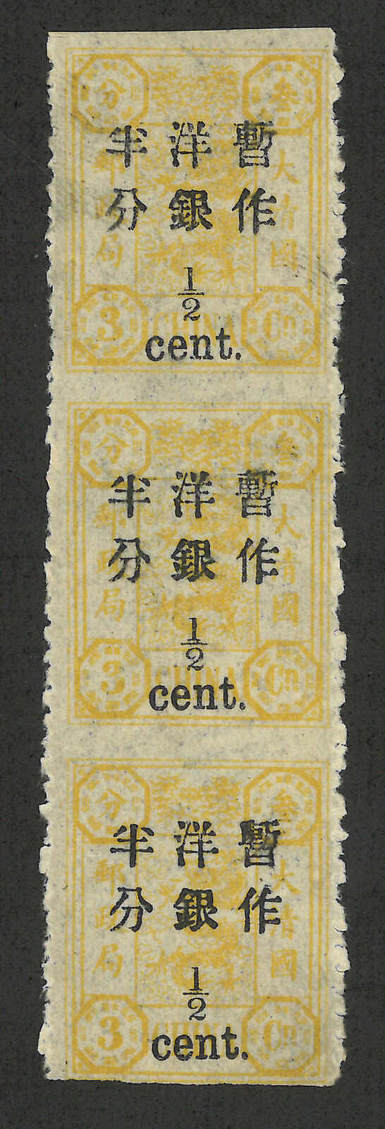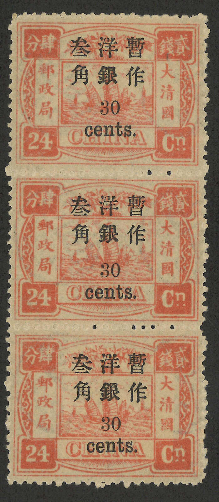 1897年慈壽初版加蓋小字3角蓋24分銀直三連新,中間一枚長距4毫米,下方一枚破“銀”字(陳目46a, 46d),原膠輕貼。1991.9 倫敦蘇富比Major James Starr專場,拍品號457。(Image 1)