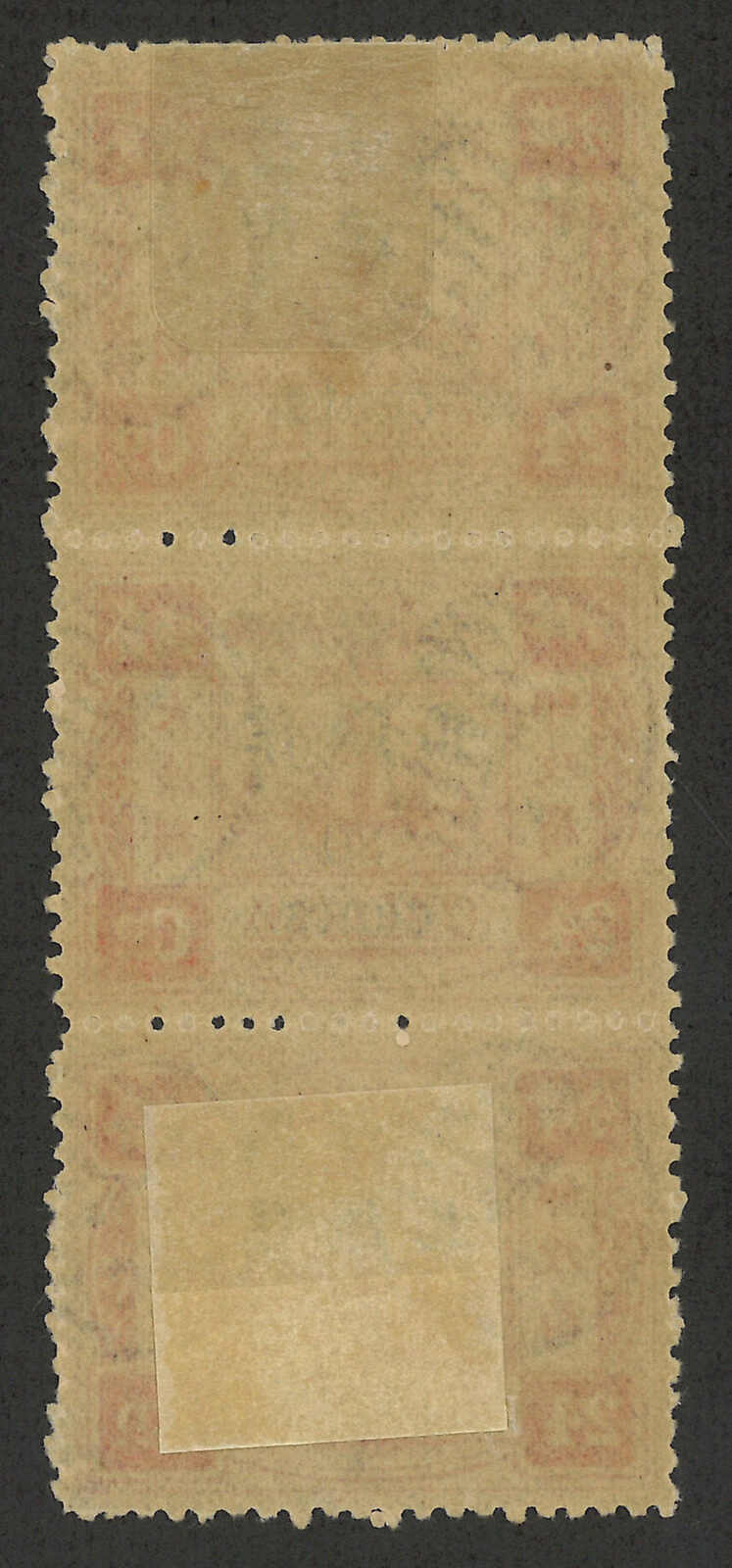 1897年慈壽再版加蓋大字長距半分蓋3分銀直方連新,帶中縫漏齒變異(陳目56eii),原膠輕貼。頂邊及底邊齒孔被剪。(Image 1)