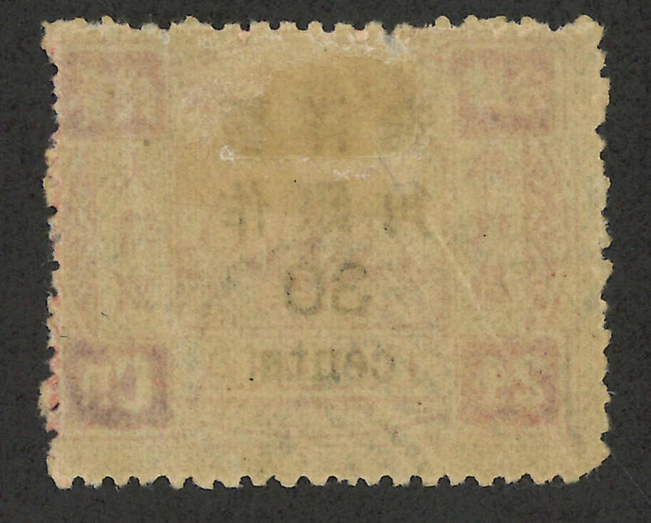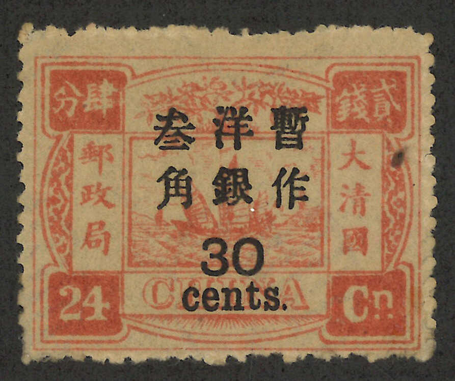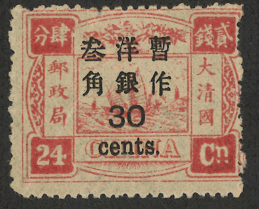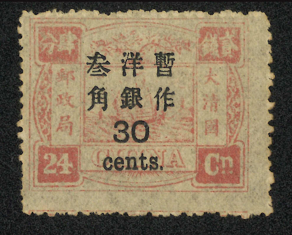 1897年慈壽初版加蓋大字長距3角蓋24分銀新,帶“30”上移變異(陳目55),原膠背貼。背面帶有Holcombe簽署。此變異票存世僅11枚新票及3枚舊票,稀罕難得。(Image 1)