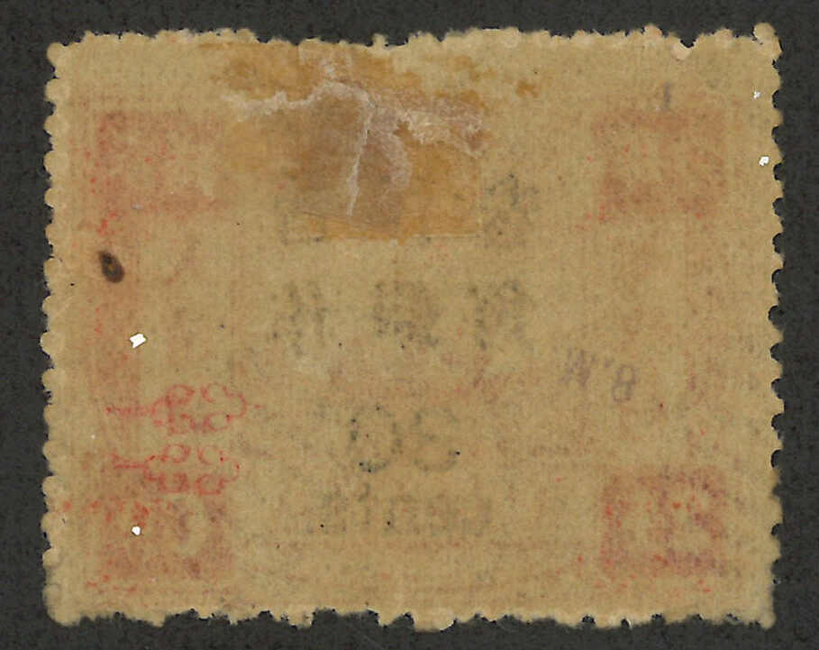 1897年慈壽初版加蓋小字3角蓋24分銀舊票,帶有“Cn”之“n”破版成兩小點變異(陳目46),銷八卦戳。 可能為目前所見最大之破版變異,存世者原票及加蓋票不過約五件。(Image 1)