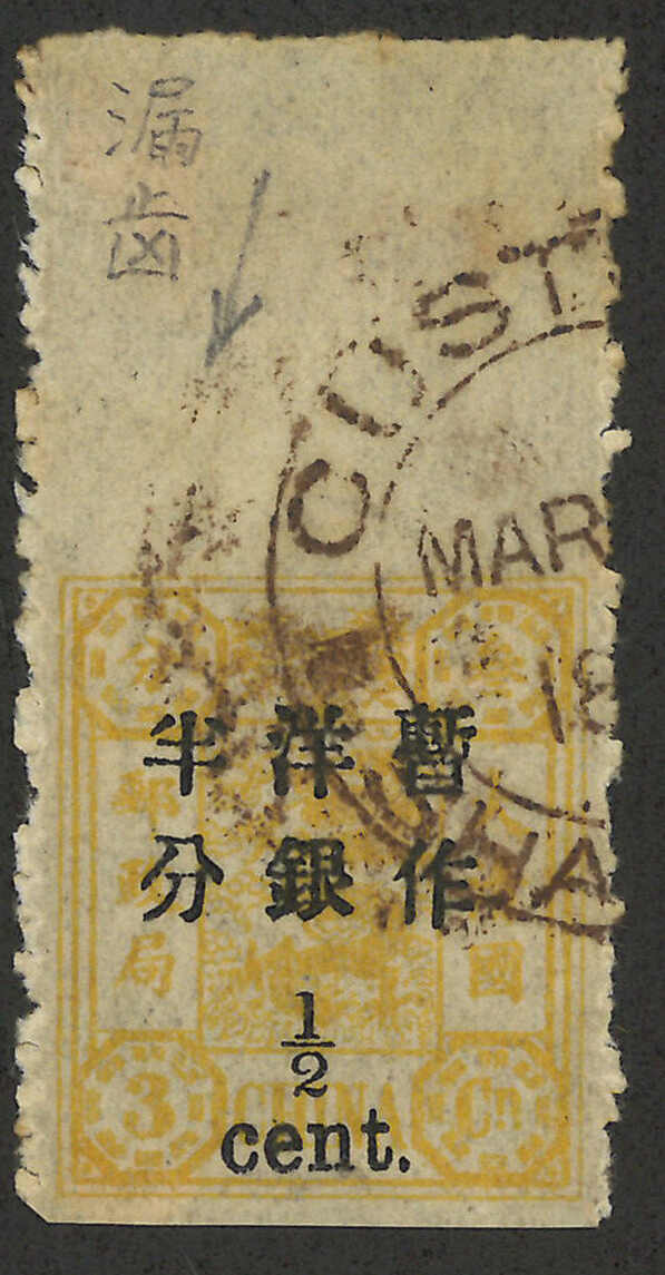 1897年慈壽再版加蓋大字長距半分蓋3分,帶過橋頂邊,頂邊漏齒變異(陳目56),銷上海海關日戳。底邊齒孔被剪。(Image 1)