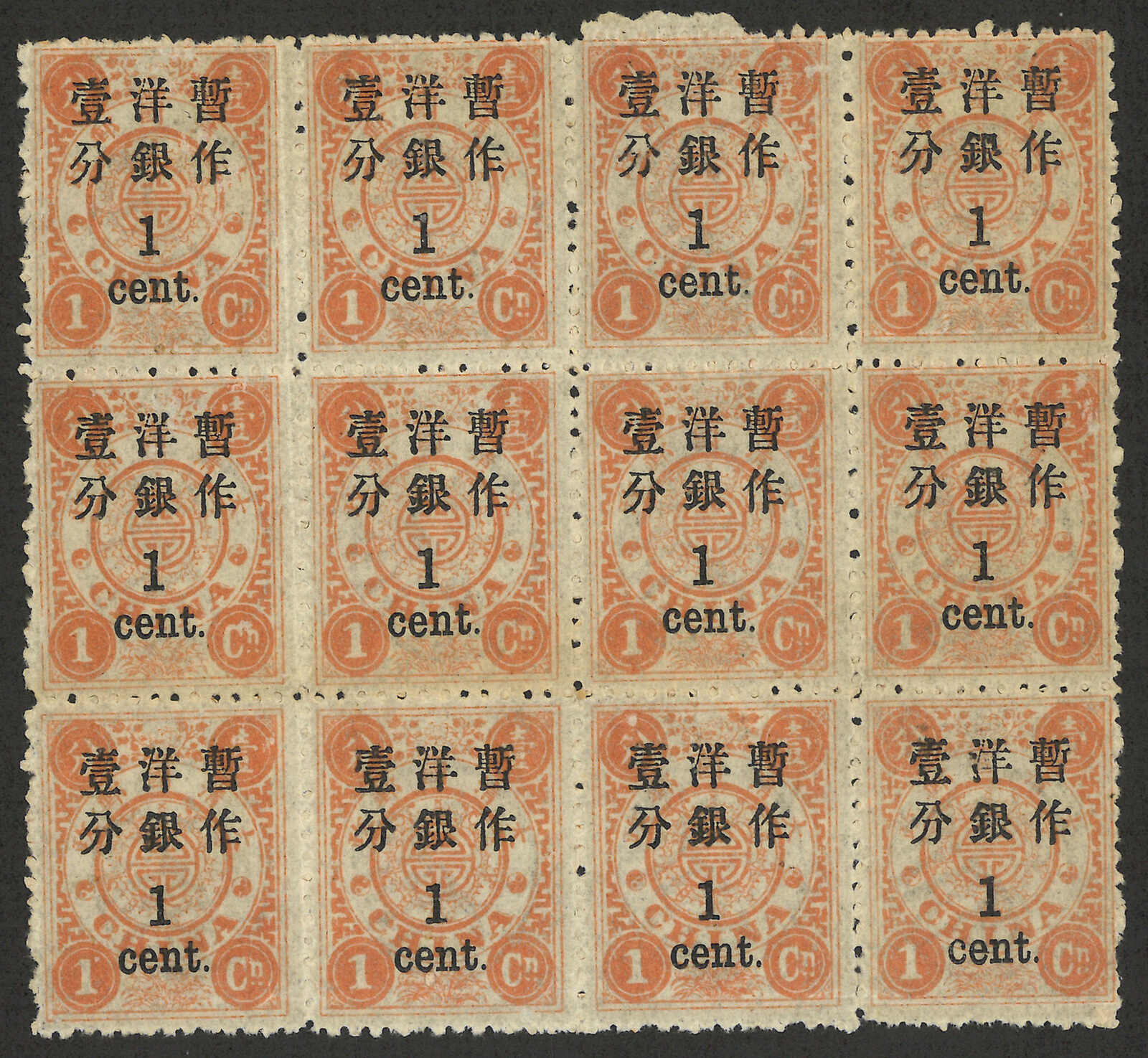 1897 Empress Dowager 2nd print surch large figure, wide spaced 1c on 1ca in block of 12 (Chan 57), MLH with original gum.