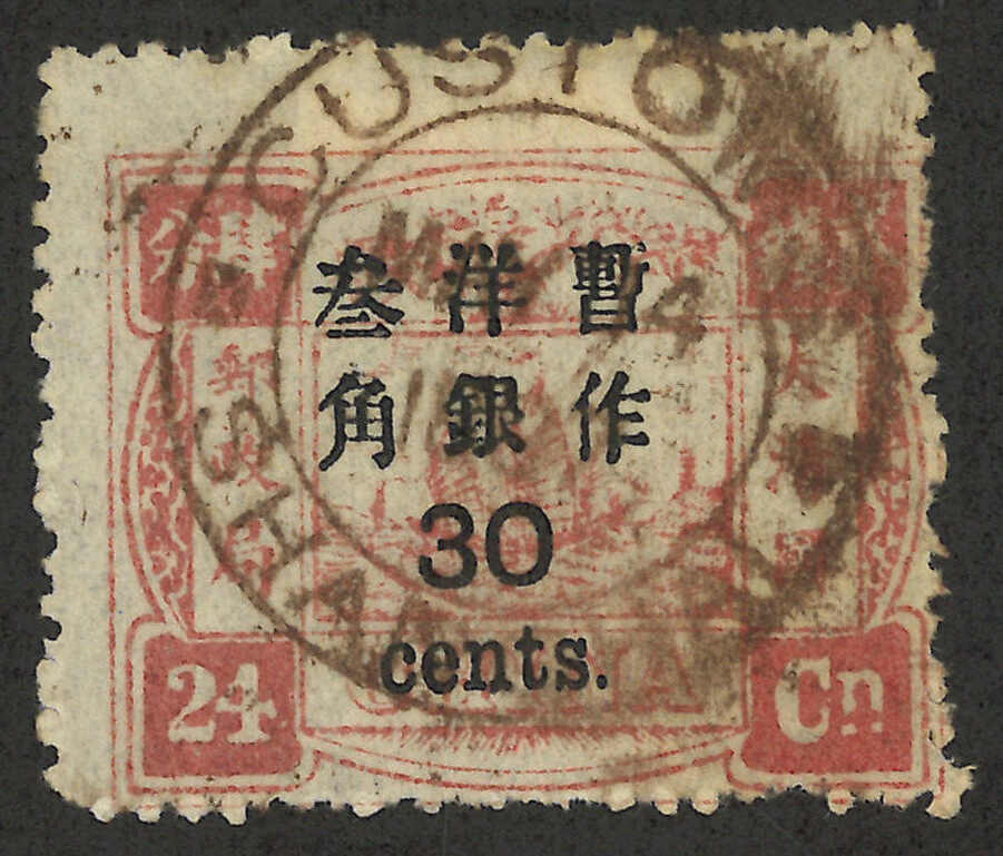 1897年慈壽再版加蓋大字長距3角蓋24分銀,“30”及“cents”之間距離2毫米(陳目64d),銷上海海關日戳。背面帶集郵家名字章。(Image 1)