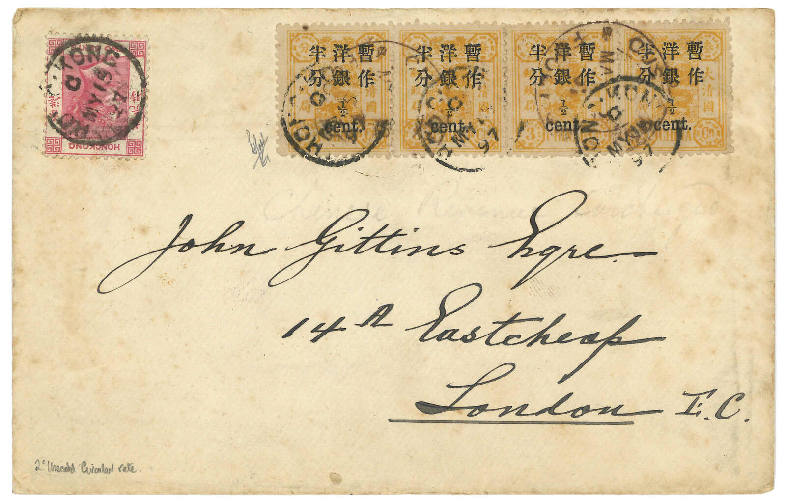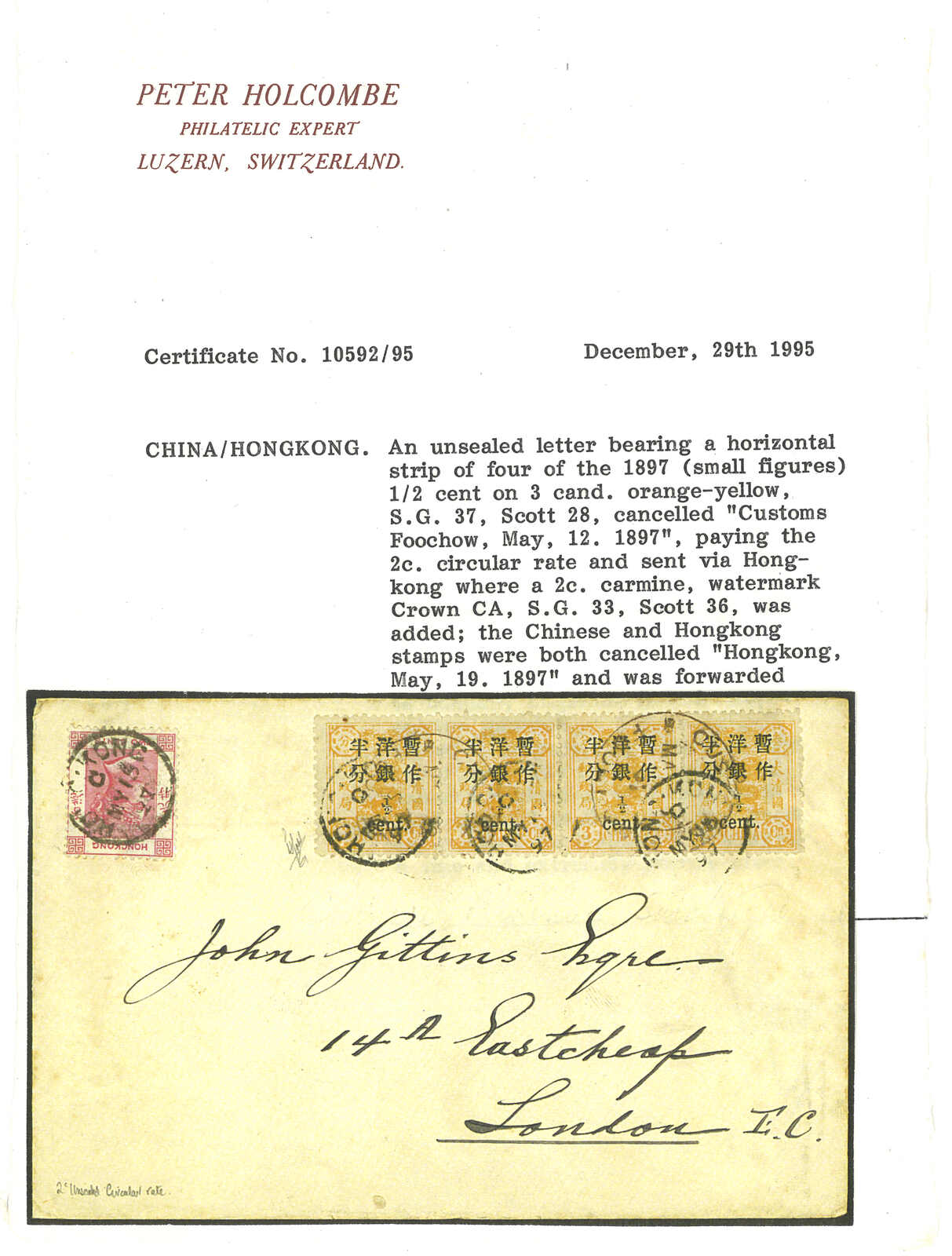 1897.5.12 福州寄英國。印刷品封,貼慈壽加蓋小字半分橫四連,銷福州海關日戳。加貼香港維多利亞女皇像2仙,銷香港C字日戳。附Peter Holcombe證書及鉛筆簽名。(Image 1)