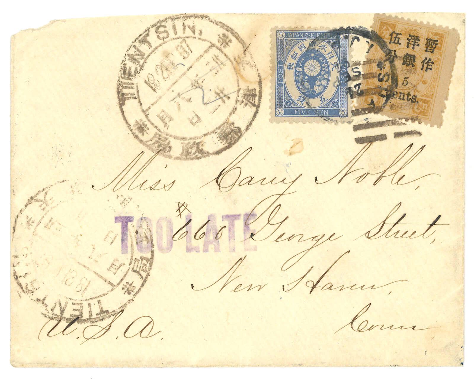 1897 Tientsin (18 Sep) to USA, f.w. Empress Dowager surch Small Figure 5c, tied by Pakua cancel., alongside with Tientsin Dollar cds (with inverted S of SEP). Transit Shanghai (22 Sep). In combination with Japanese Koban 5s,