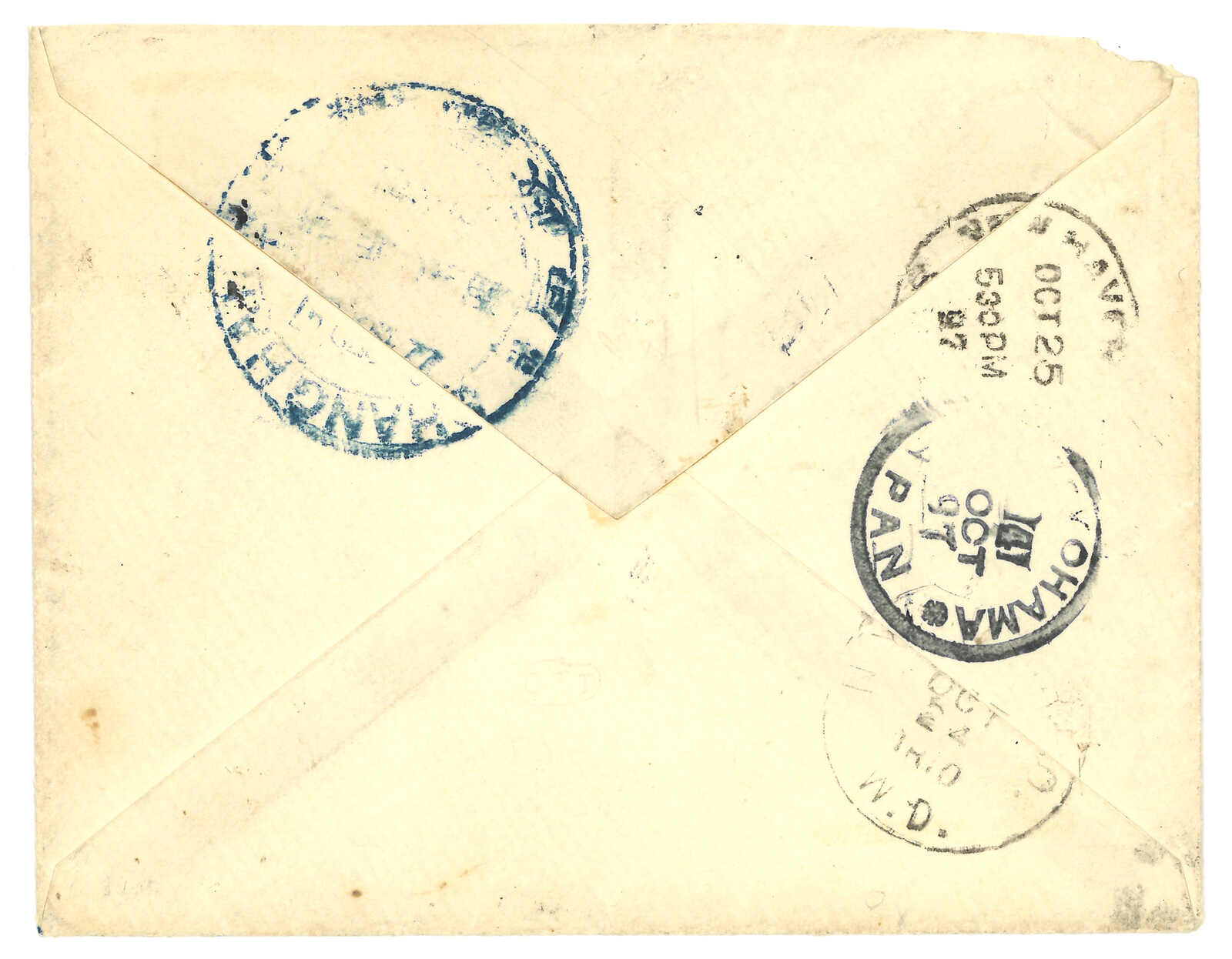 tied by IJPO Shanghai (24 Sep) cds. Transit Yokohama (4 Oct). Arrived USA (25 Oct). On front with TOO LATE cachet. Late example of IJPO concessinoary rate 5s to USA. This rate was only applicable to mails to Japan after 30 Sep. Illustration p. 966 in