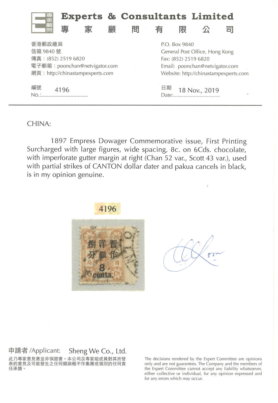 1897年慈壽初版加蓋大字長距8分蓋6分銀舊票,帶右邊過橋漏齒變異(陳目52),銷廣州大圓戳及八卦戳。此變異票存世僅約五六枚,此為當中品相極佳者,相當難得。附證書。(Image 1)