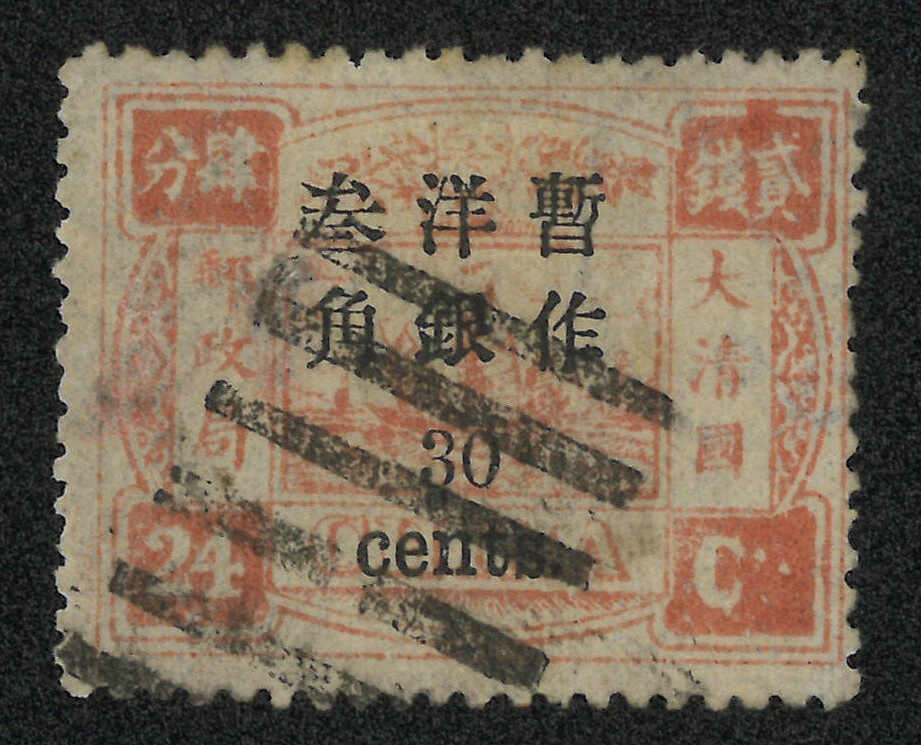 1897 Empress Dowager 2nd print surch large figure, wide spaced 30c on 24ca, with 2mm distance between "30" and "cents" variety (Chan 64d), used by Customs Shanghai cds. With name seal of philatelist on reverse. F-VF.