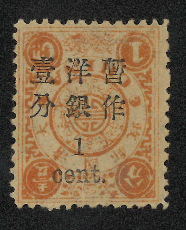 1897年慈壽加蓋小字1分蓋1分銀新,帶加蓋倒蓋變異(陳目38d),原膠無貼。小字加蓋1分倒蓋票相信存世僅八十枚(兩盤格各四十枚),當中僅約四分一為新票,餘大多銷漢口八卦戳、大圓戳或海關戳。經典之“四複八倒”之一。(Image 1)
