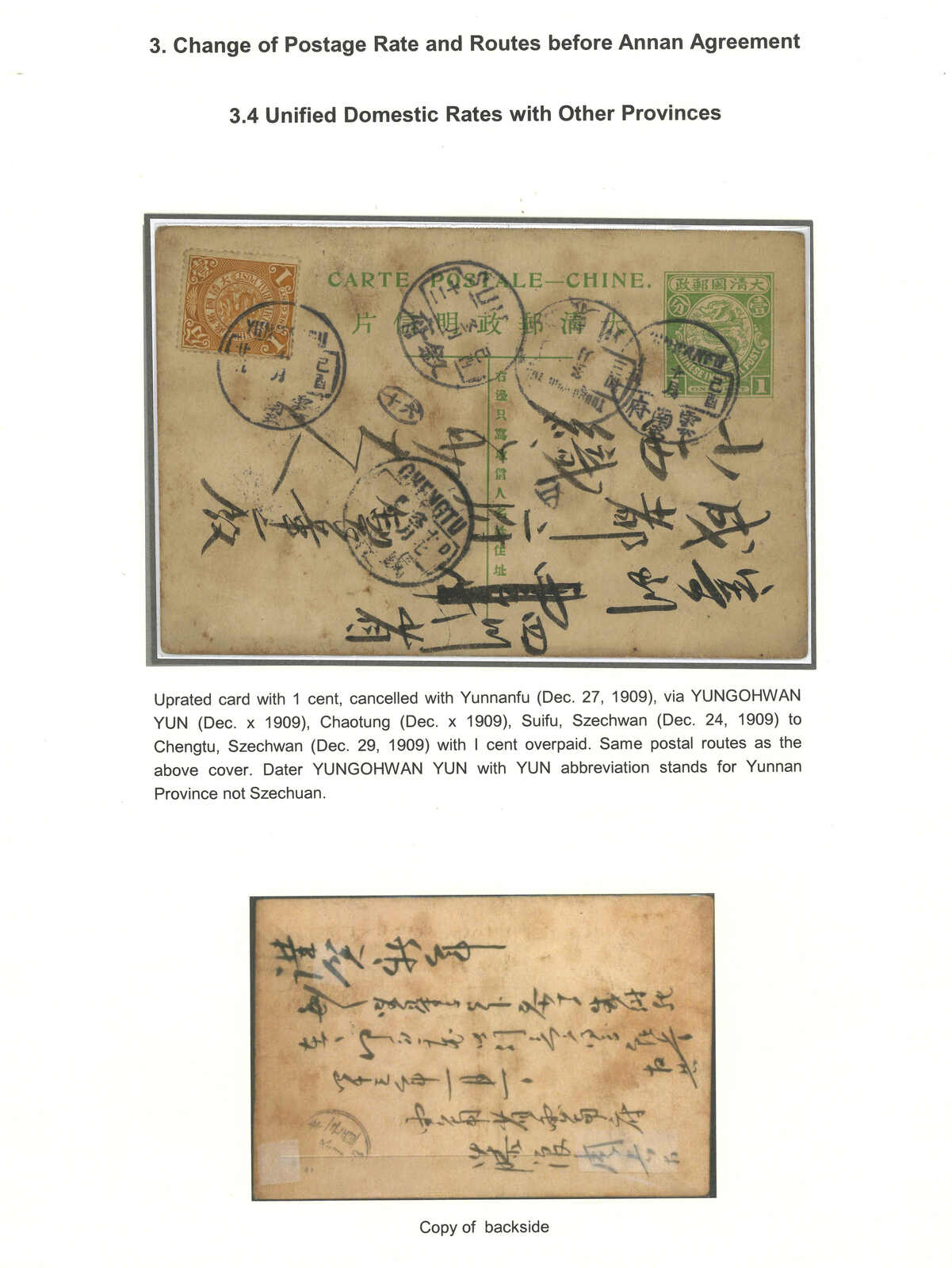 1909.12.7 雲南府寄成都。大清第四版郵資片,加貼蟠龍1分,銷雲南府腰框干支日戳。12.15經東川,12.24經昭通。抵成都。國內明信片郵資例子。(Image 1) (Image 2)