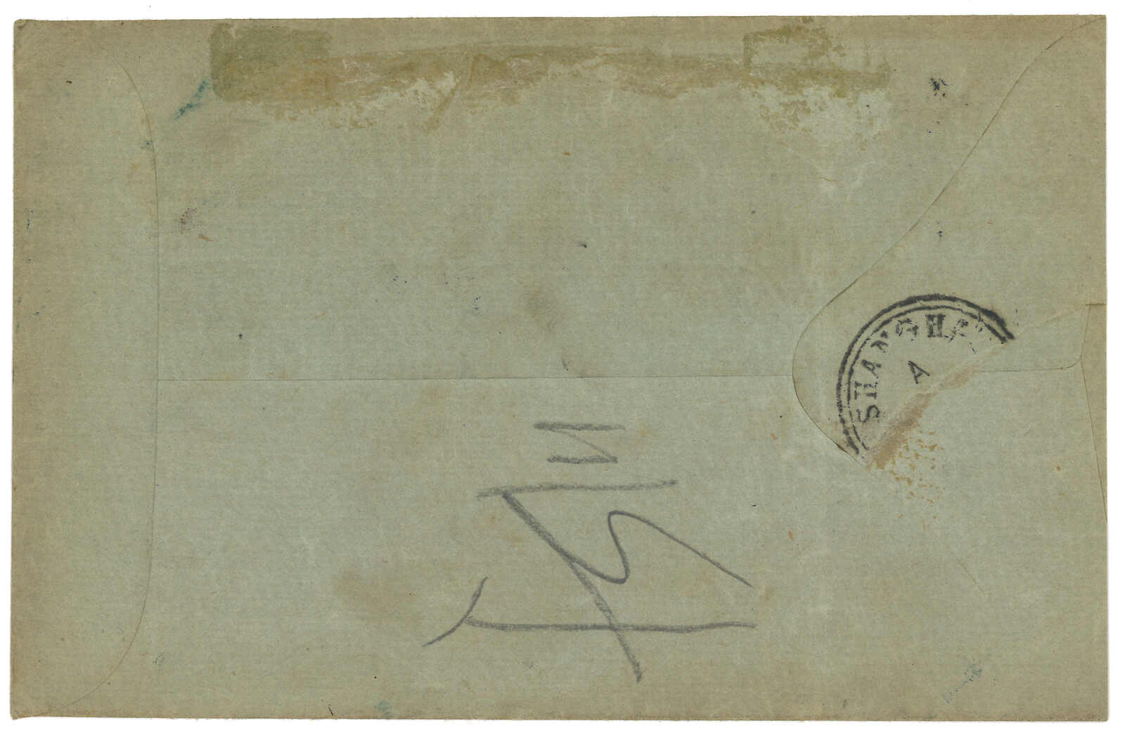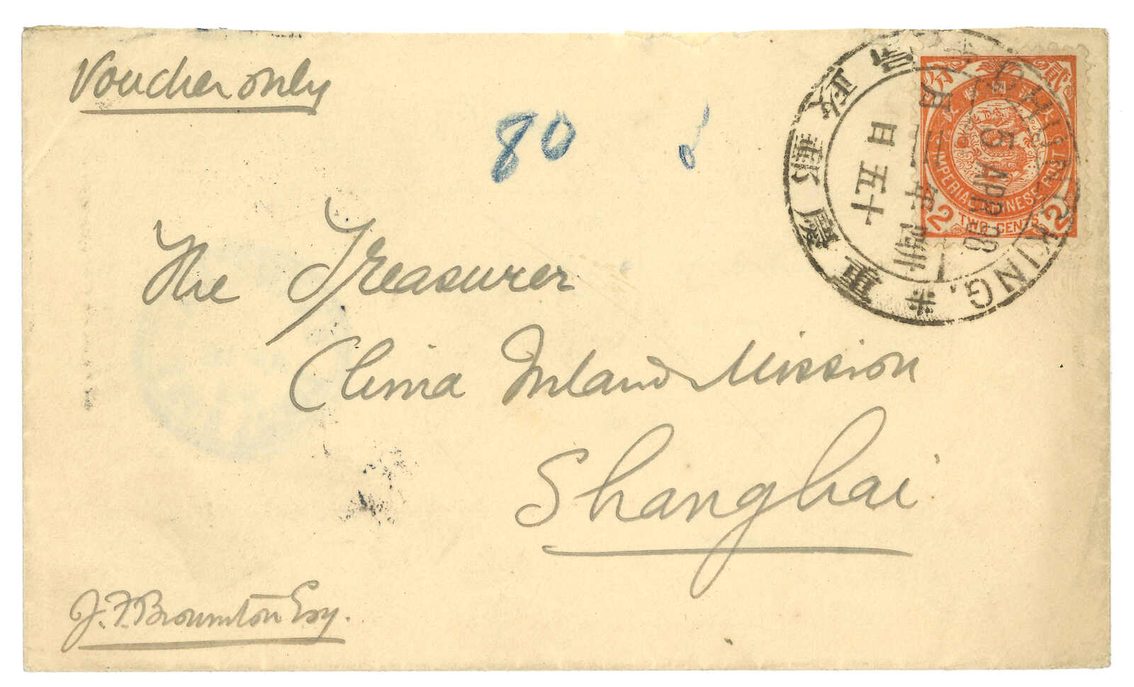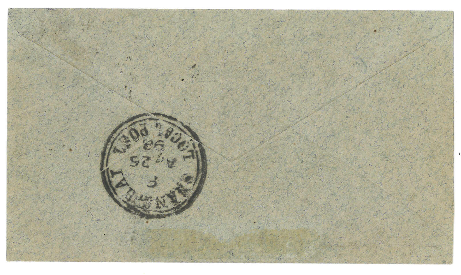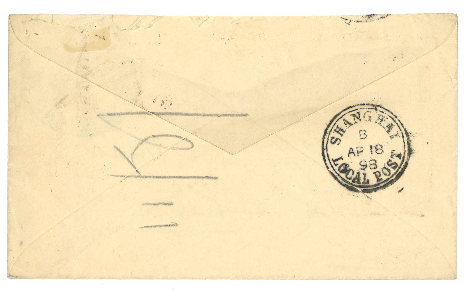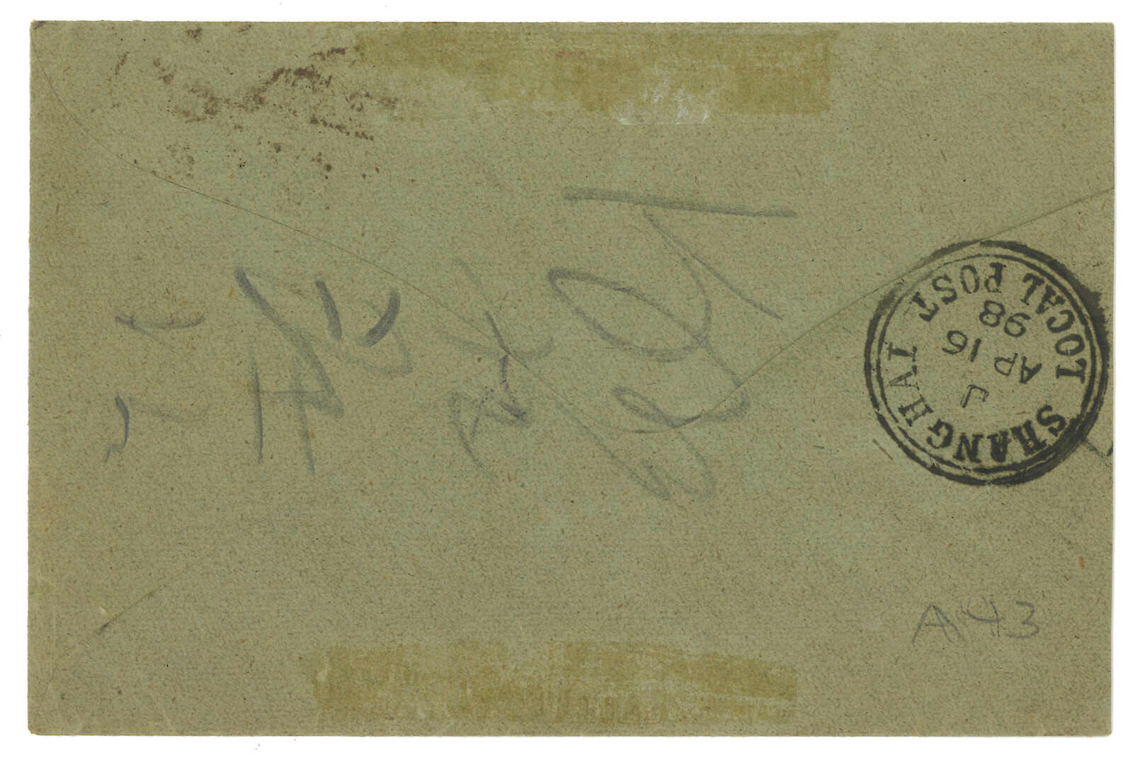 100 cover image1898 Chungking (5 Apr) to China Inland Mission, Shanghai, f.w. Litho Dragon 2c, tied by Chunking Dollar cds. Arrived Shanghai LPO (18 Apr). 2010 (Jan) Interasia, lot 941.
