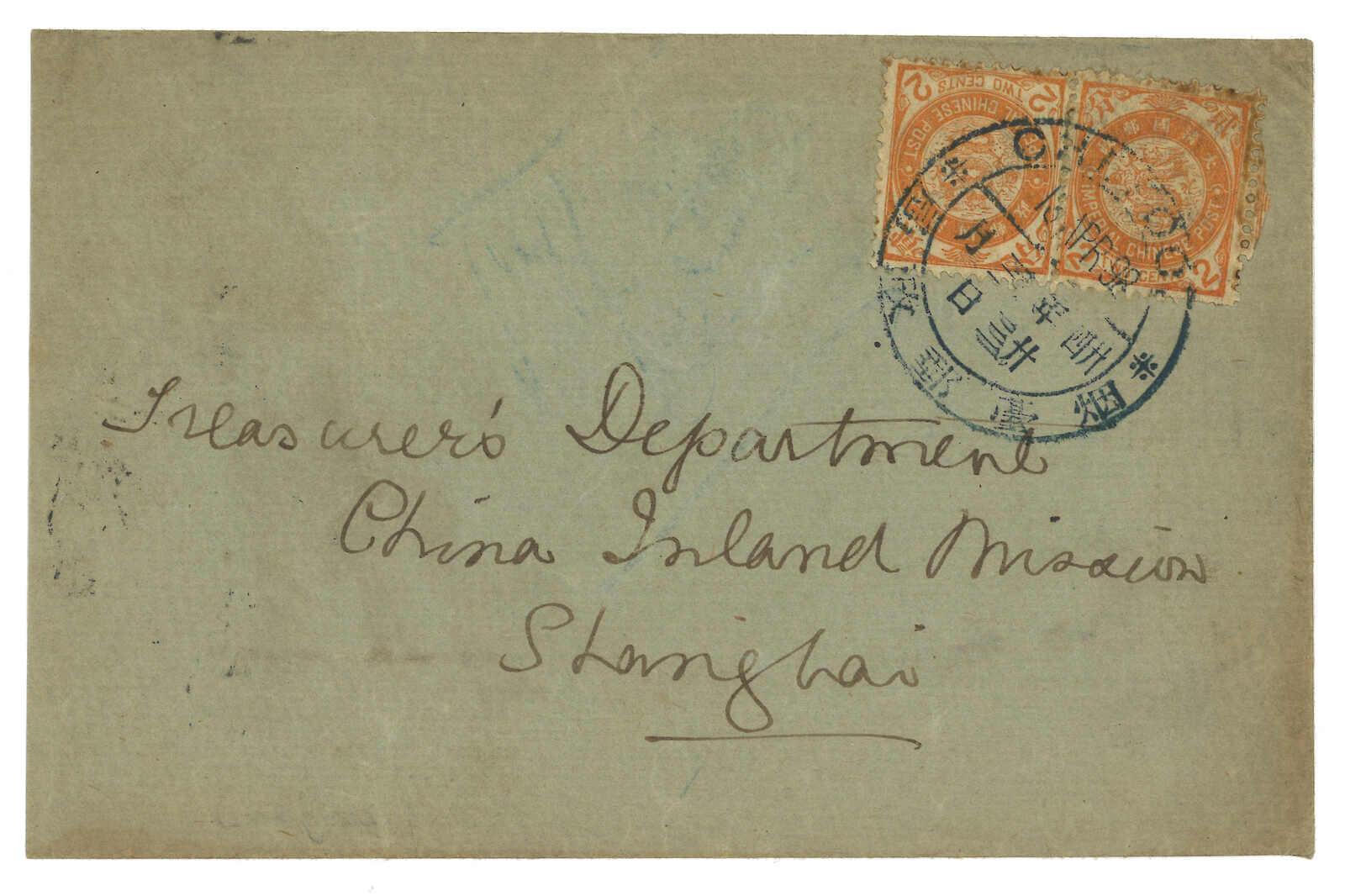 96 cover image1898 Chefoo (13 Apr) to China Inland Mission, Shanghai, f.w. Litho Dragon 2c in pair, tied by Chefoo Dollar cds. Arrived Shanghai LPO. 2019 (Oct) John Bull, lot 5340.