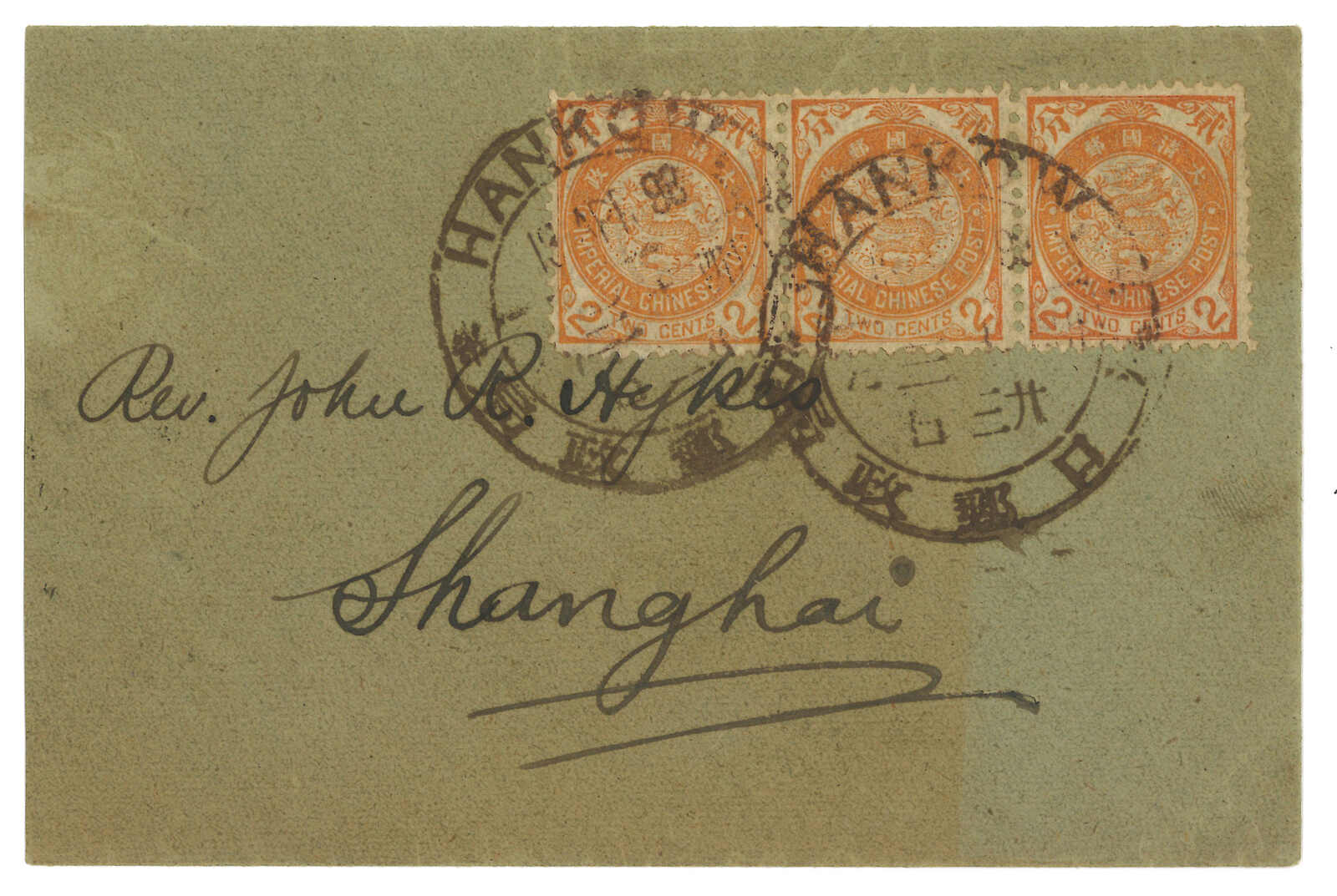 1898.4.13 漢口寄上海,貼日本版蟠龍2分橫三連,銷漢口大圓戳。4.16抵上海工部郵局。封左側被裁。2008.12 Interasia。(Image 1) (Image 2)