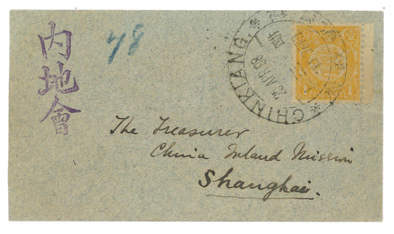 1898.4.25 鎮江寄上海中國內地會,貼日本版蟠龍1分,銷鎮江大圓戳。4.25抵上海工部郵局。2002.11 蘇黎世亞洲。(Image 1) (Image 2)