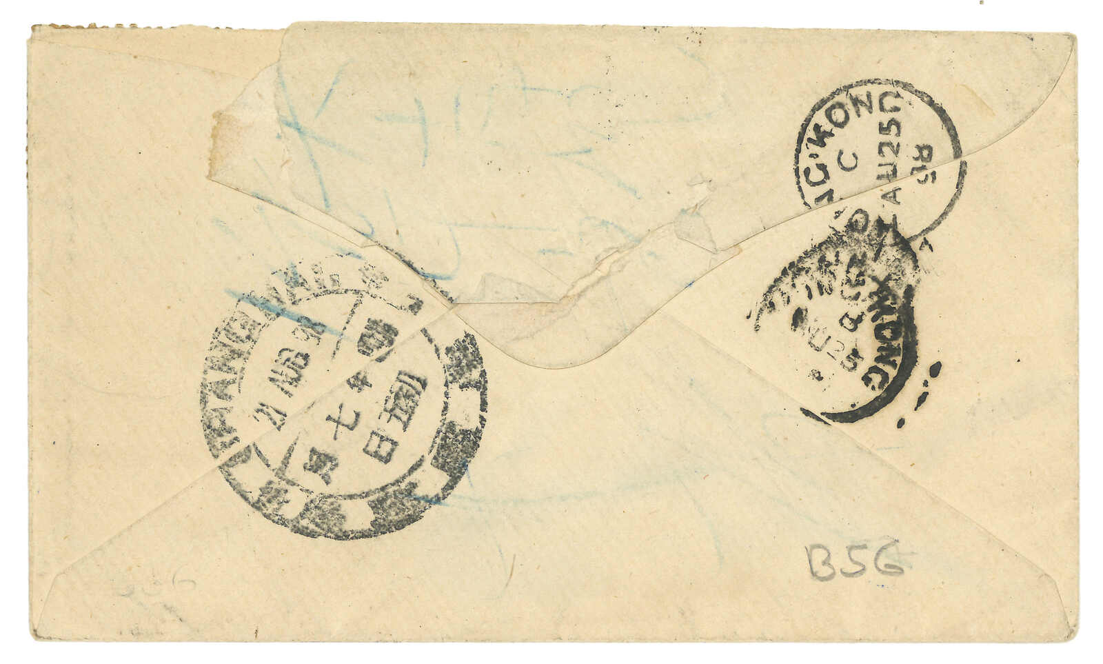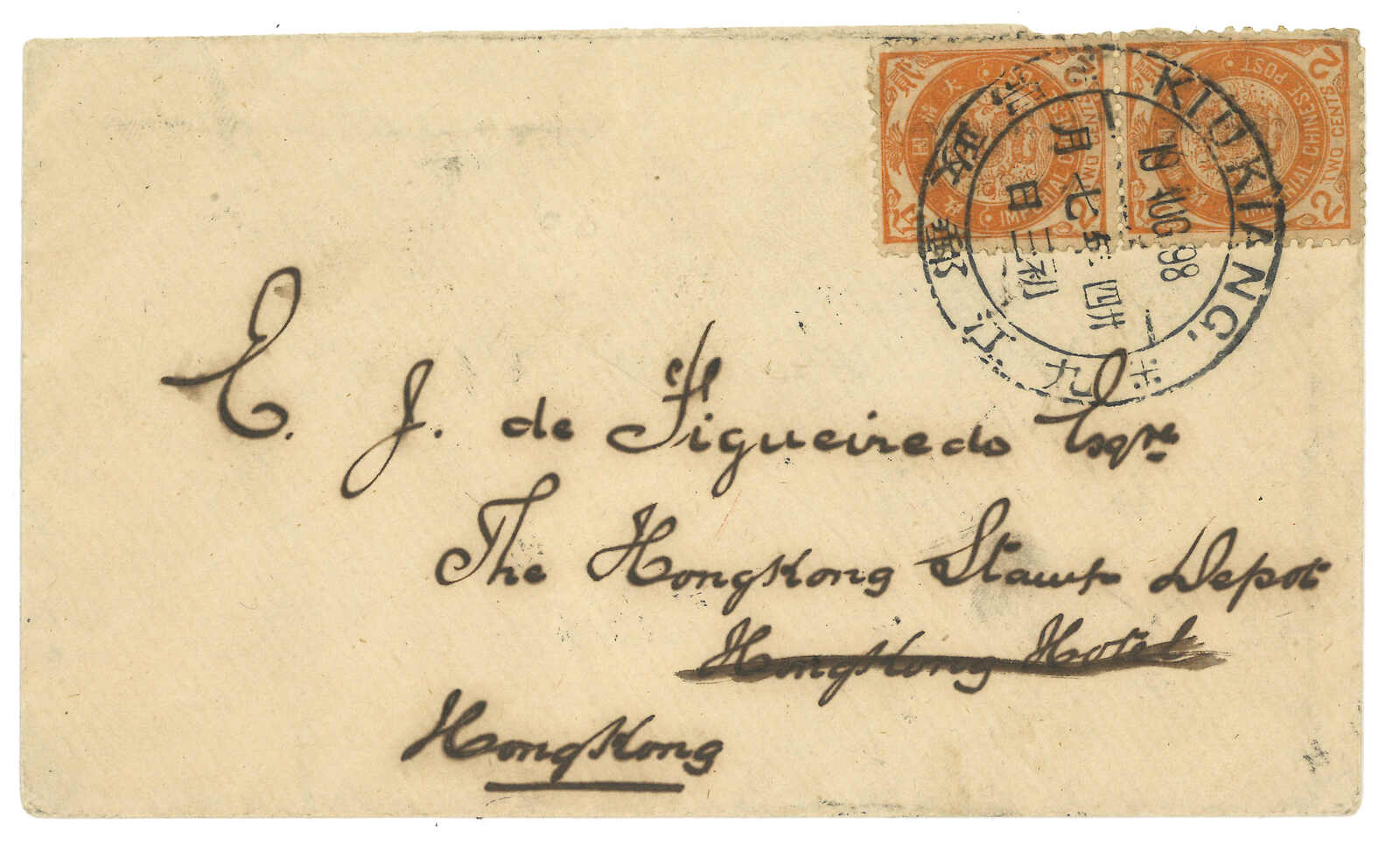 1898.8.19 九江寄香港,貼日本版蟠龍2分雙連,銷九江大圓戳。8.21經上海,鈐大圓戳。8.25抵香港。2008.12 Interasia。(Image 1) (Image 2)