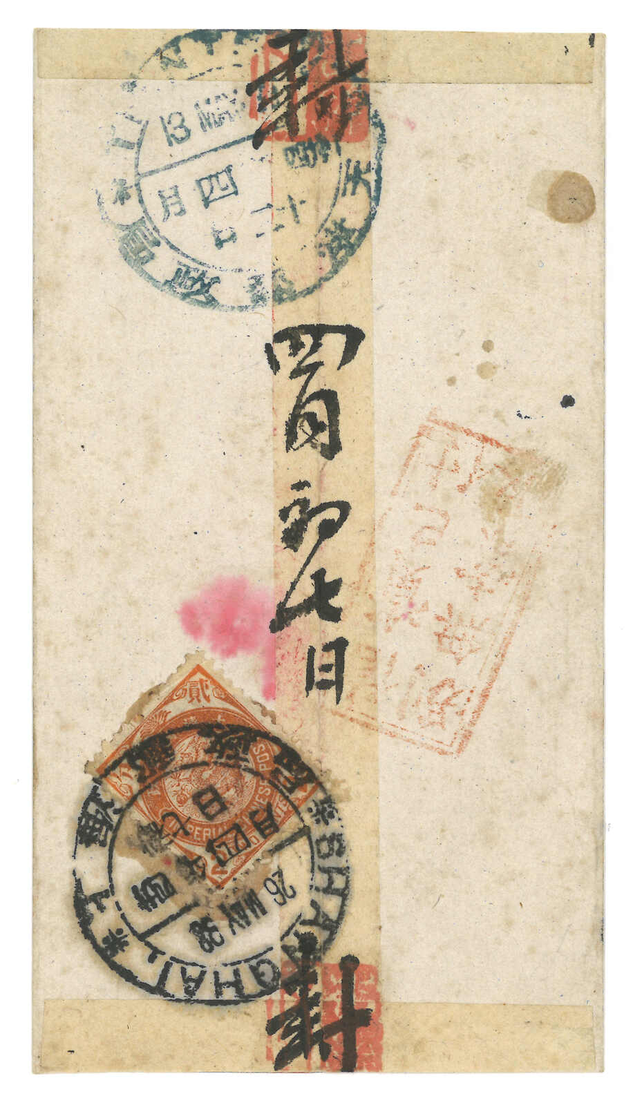 109 cover image1898 Shanghai (26 May) to Tientsin. Red band cover, f.w. Litho Dragon 2c on reverse, tied by Shanghai dollar cds, alongside with "Postage Paid / No More Charges" cachet. Arrived Tientsin (31 May; wrongly inserted as "13") with dollar cds. 2007 (Oct) John Bull, lot 1005.