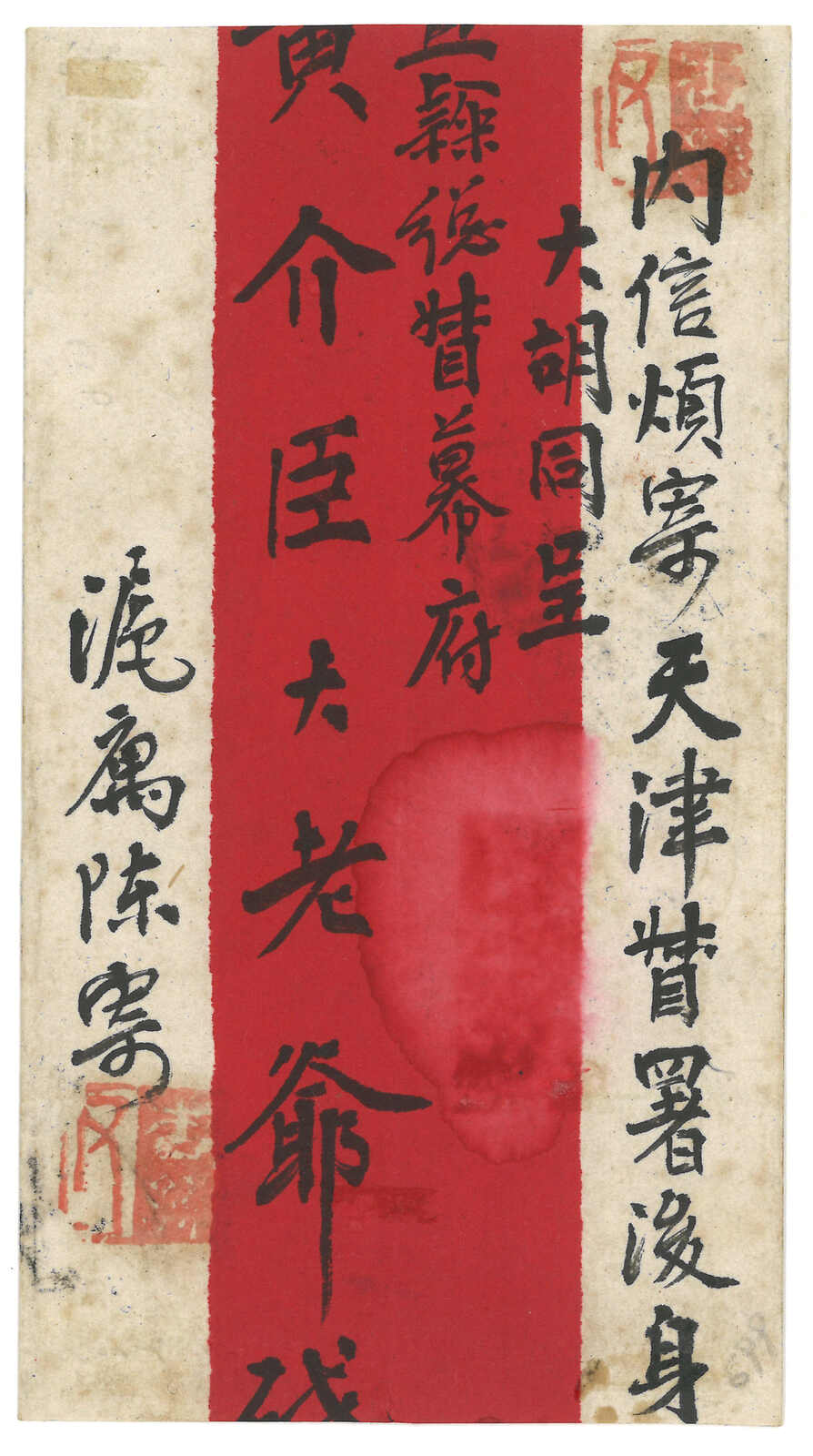 1898.5.26 上海寄天津。紅條封,背貼日本版蟠龍2分,銷上海大圓戳,旁鈐“信資已付 / 別無索取”指示戳。5.31抵天津(大圓戳誤植日期為13)。2007.10 布約翰,拍品號1005。(Image 1) (Image 2)