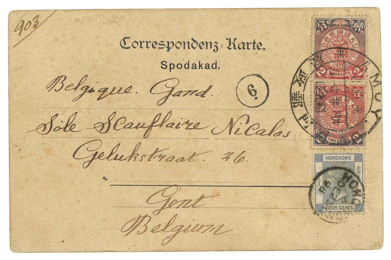 1898.12.21 廈門寄比利時。約翰·馬丁·施萊爾肖像明信片,貼蟠龍2分雙連,銷廈門大圓戳。加貼香港維多利亞女皇像4仙,銷香港12.23日戳。2002.11 蘇黎世亞洲,拍品號676。(Image 1) (Image 2)
