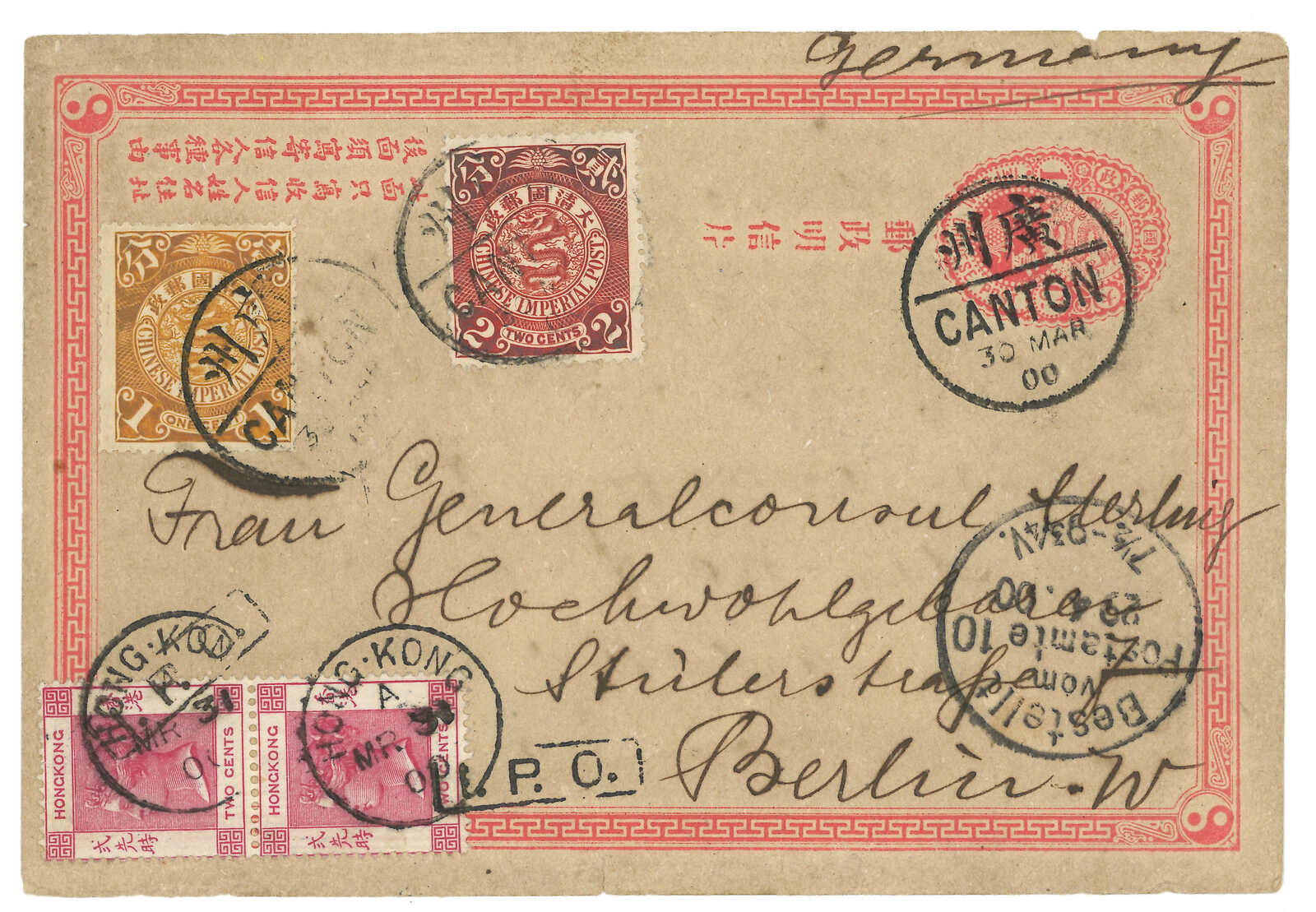 1900.3.30 廣州寄德國。大清第一版郵資片,加貼蟠龍1分 + 2分,銷廣州半切漢英日戳。加貼香港維多利亞女皇像2仙雙連,銷廣州Webb 1型IPO騎縫戳及香港3.31日戳。4.29抵德國。2004.12 蘇黎世亞洲,拍品號324。(Image 1) (Image 2)