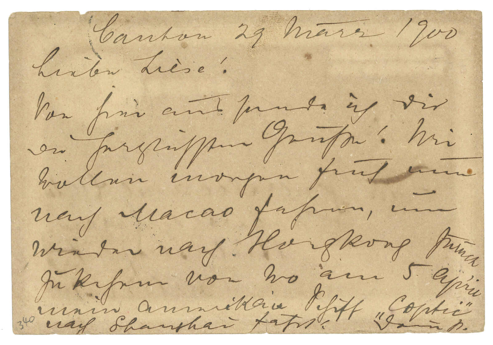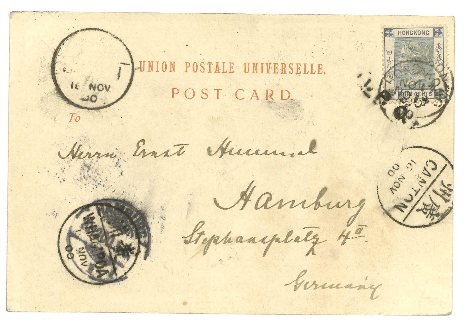 1900.11.15 黃埔寄德國。香港馬賽圖片明信片,鈐黃埔半切漢英日戳。11.16經廣州中國郵局。貼香港維多利亞女皇像4仙,銷廣州Webb 1型IPO騎縫戳及香港日戳。12.20抵漢堡。2009.3 布約翰,拍品號2505。(Image 1) (Image 2)