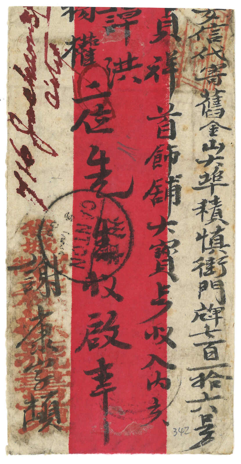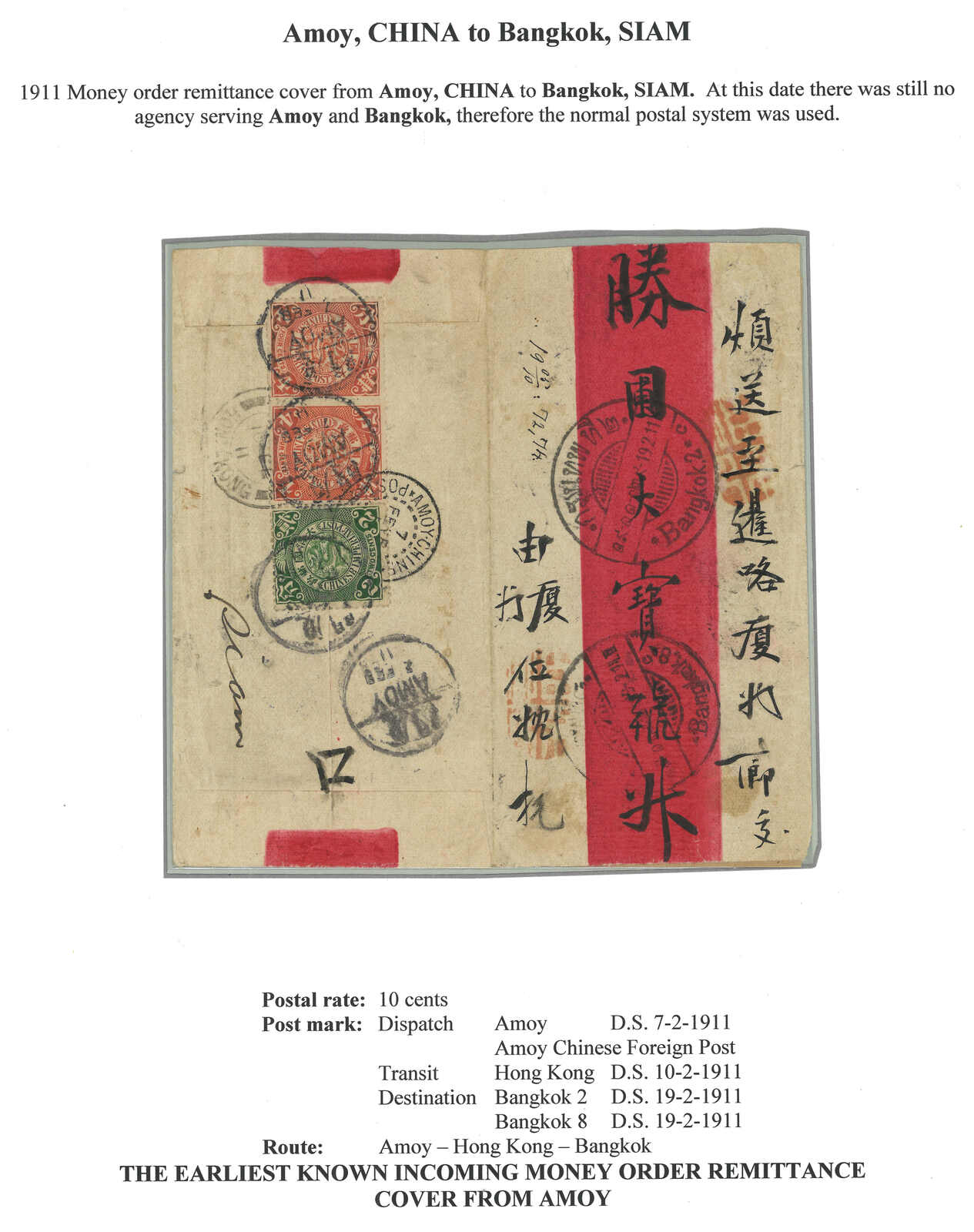 3167 cover image1911 Amoy (7 Feb) to “Amoy Hallway”, Bangkok. Remittance red band cover, f.w. Coiling Dragon 2c + 4c in pair on reverse, tied by Amoy bisected bilingual cds. Transit Amoy French PO (7 Feb), Hong Kong (10 Feb). Arrived Bangkok (19 Feb). “Amoy Hallway” refers to the community of Amoy immigrants by Chao Phraya River. It is the earliest recorded money order remittance cover from Amoy. Most of the Minnan people resided in other Southeast Asian countries instead of Siam. Examples are therefore more unusual. Cover opened out for display.