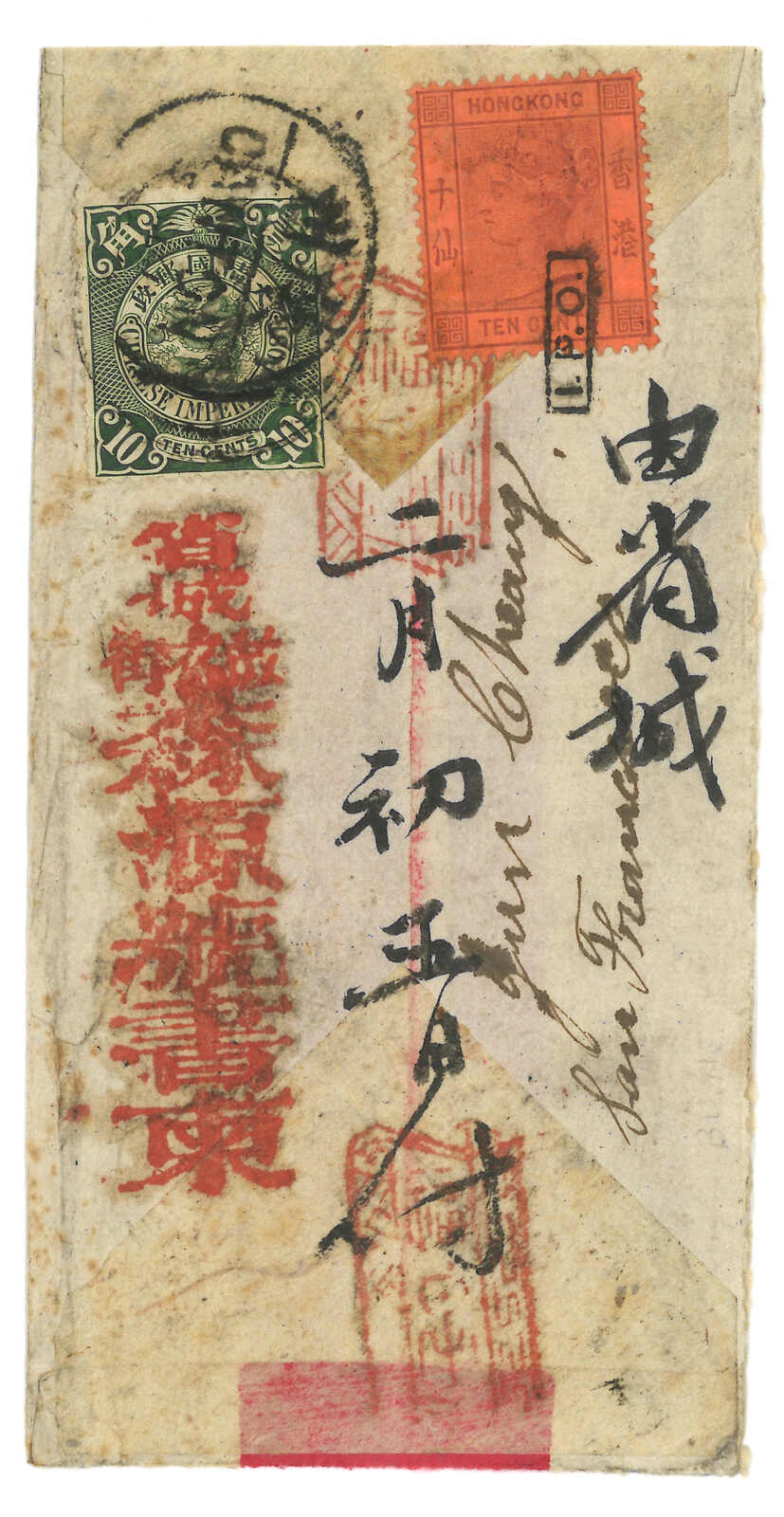 129 cover image1900 Canton (5 Mar) to USA. Red band cover, f.w. Coiling Dragon 10c on reverse, tied by Canton bisected bilingual cds. In combinaiton with Hong Kong QV 10c, tied by Canton Webb type 3 IPO tie-print but no Hong Kong cds. 2004 (Dec) Zurich Asia, lot 326.