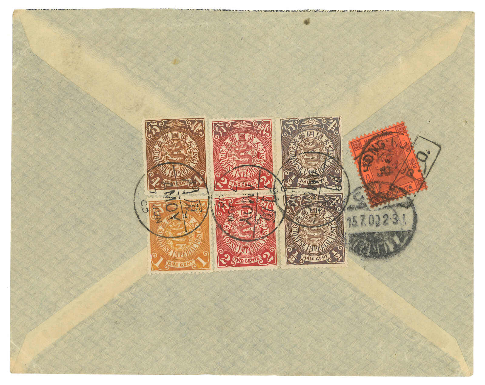 126 cover image1900 Amoy (7 Jun) to Germany, f.w. Coiling Dragon x6 on reverse, in total of 10c, tied by Amoy bisected bilingual cds. In combination with Hong Kong QV 10c, tied by Amoy IPO tie-print and Hong Kong (Jun) cds. Arrived Germany (15 Jul). 2007 (Jun) Zurich Asia, lot 676.