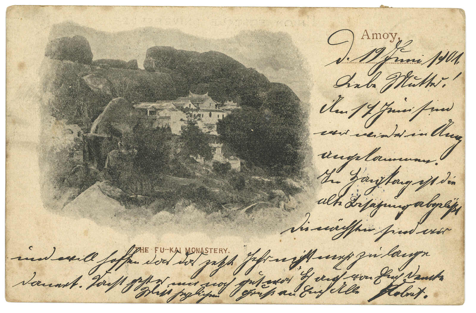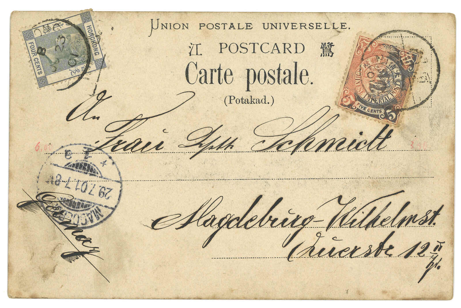 1901.6.21 廈門寄德國。寺廟圖片明信片,貼蟠龍5分,銷廈門半切漢英日戳。加貼香港維多利亞女皇像4仙,銷廈門IPO騎縫戳及香港6.23日戳。7.29抵Madeburg。(Image 1) (Image 2)