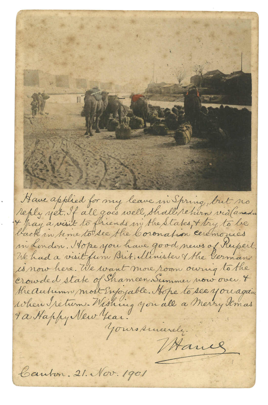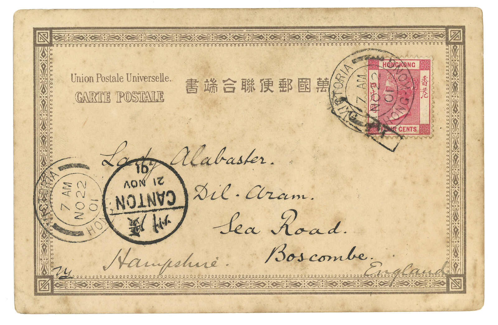 132 cover image1901 Canton (21 Nov) to England. Picture postcard, applied with Canton Chinese PO origin cds. F.w. Hong Kong QV 4c, tied by Canton Webb type 2 IPO tie-print and Victoria (22 Nov) cds. 2009 (Mar) John Bull, lot 2507.