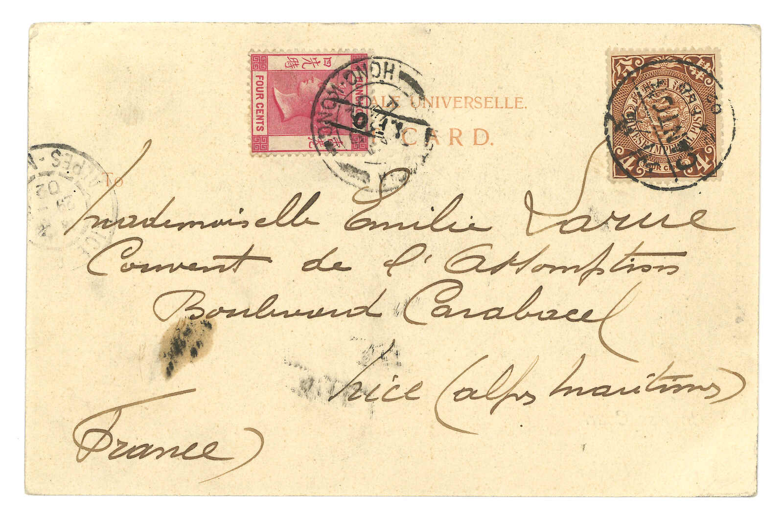 133 cover image1902 Canton (24 Feb) to France. Chinese court PPC, f.w. Coiling Dragon 4c, tied by Canton bisected bilingual cds. In combination with Hong Kong QV 4c, tied by Canton Webb type 2 IPO tie-print and Victoria cds. Arrived France (29 Mar). 2009 (Mar) John Bull, lot 2510.