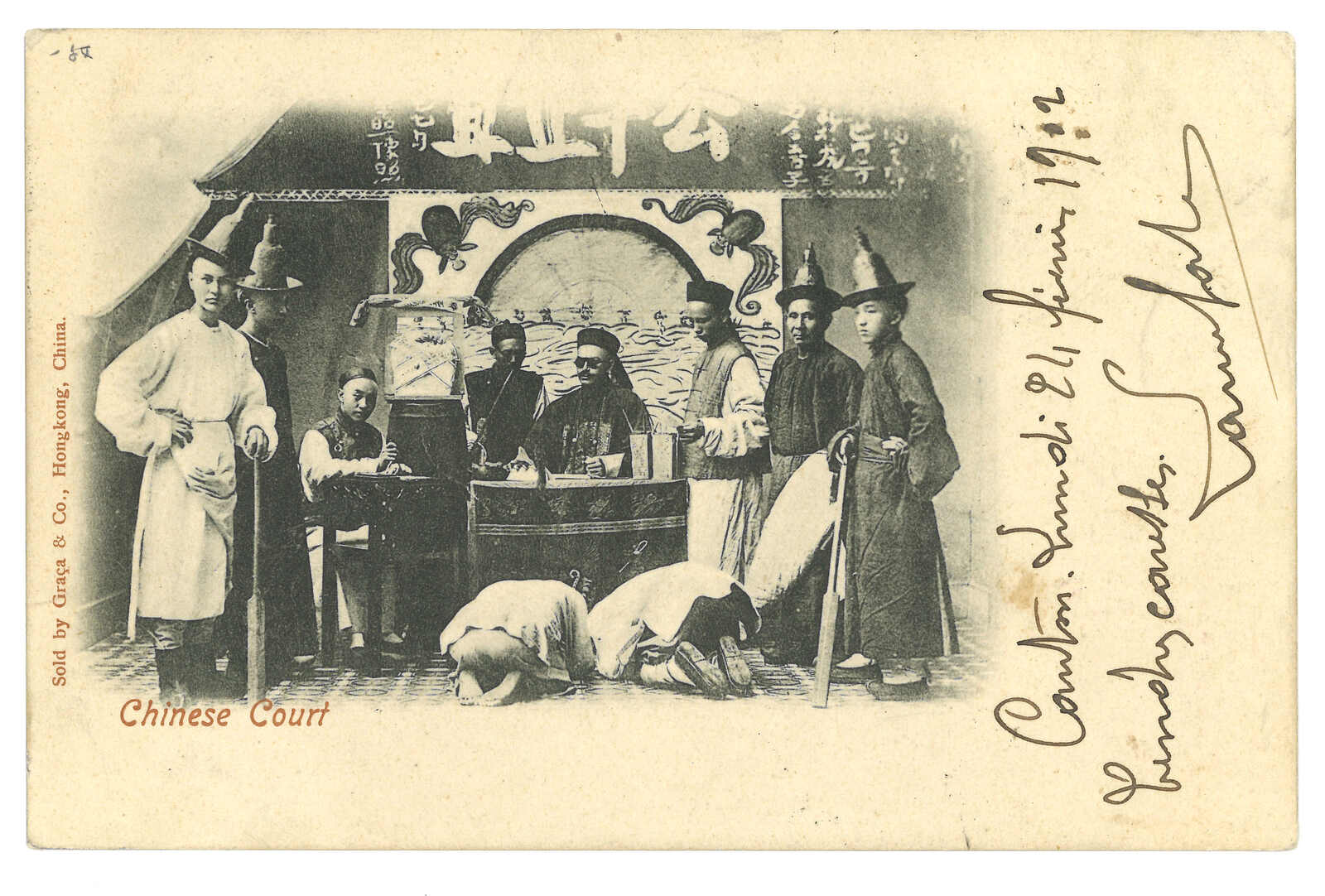 1902.2.24 廣州寄法國。官府圖片明信片,貼蟠龍4分,銷廣州半切漢英日戳。加貼香港維多利亞女皇像4仙,銷廣州Webb 2型IPO騎縫戳及維多利亞日戳。3.29抵法國。2009.3 布約翰,拍品號2510。(Image 1) (Image 2)