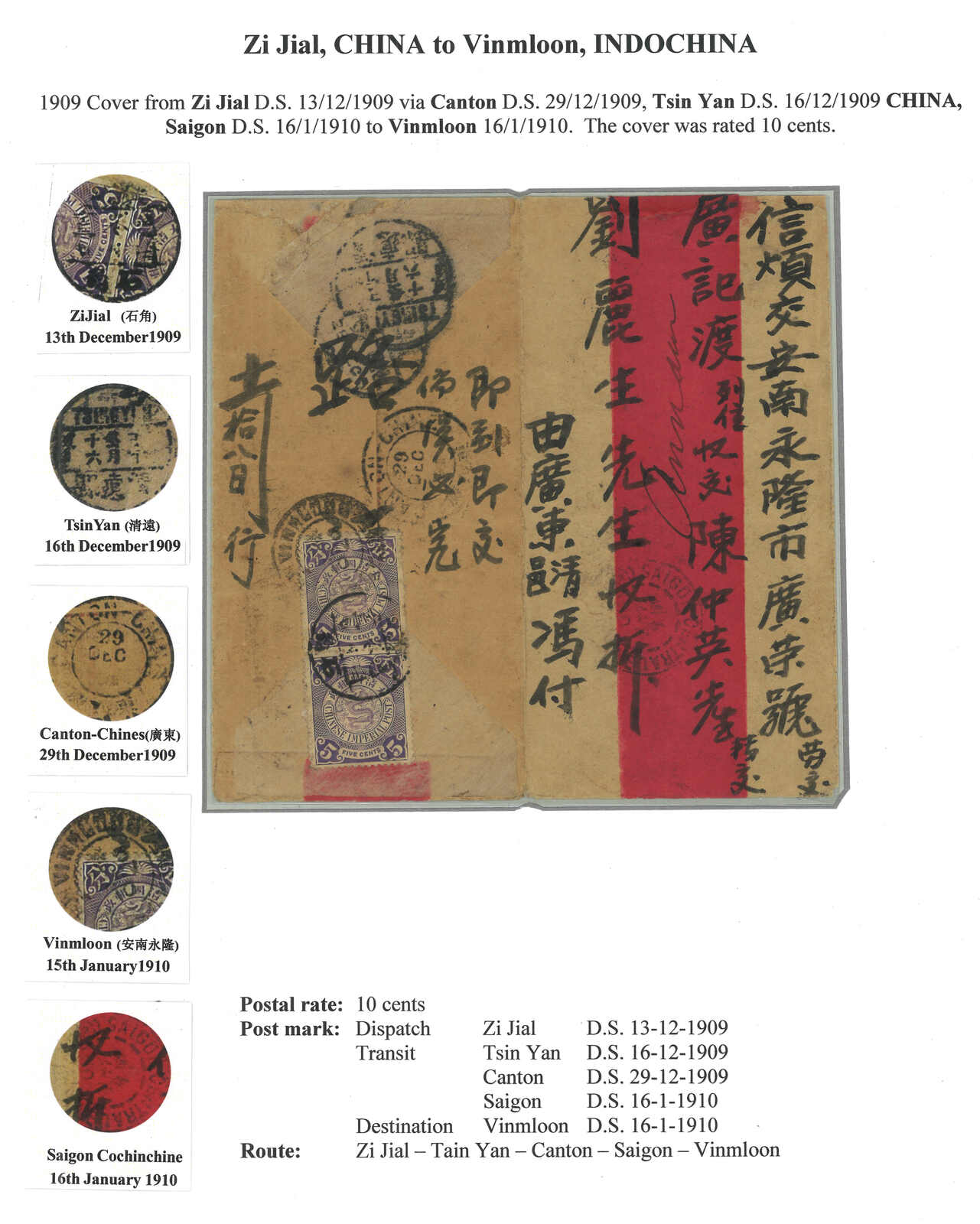 3124 cover image1909 Shekkok (13 Dec) to Vinmloon, French Indochina. Red band cover, f.w. Coiling Dragon 5c in pair, tied by Shekkok cds. Transit Tsingyun (16 Dec), Canton French PO (29 Dec), Saigon (16 Jan). Arrived Vinmloon (16 Jan). Cover opened out for display.